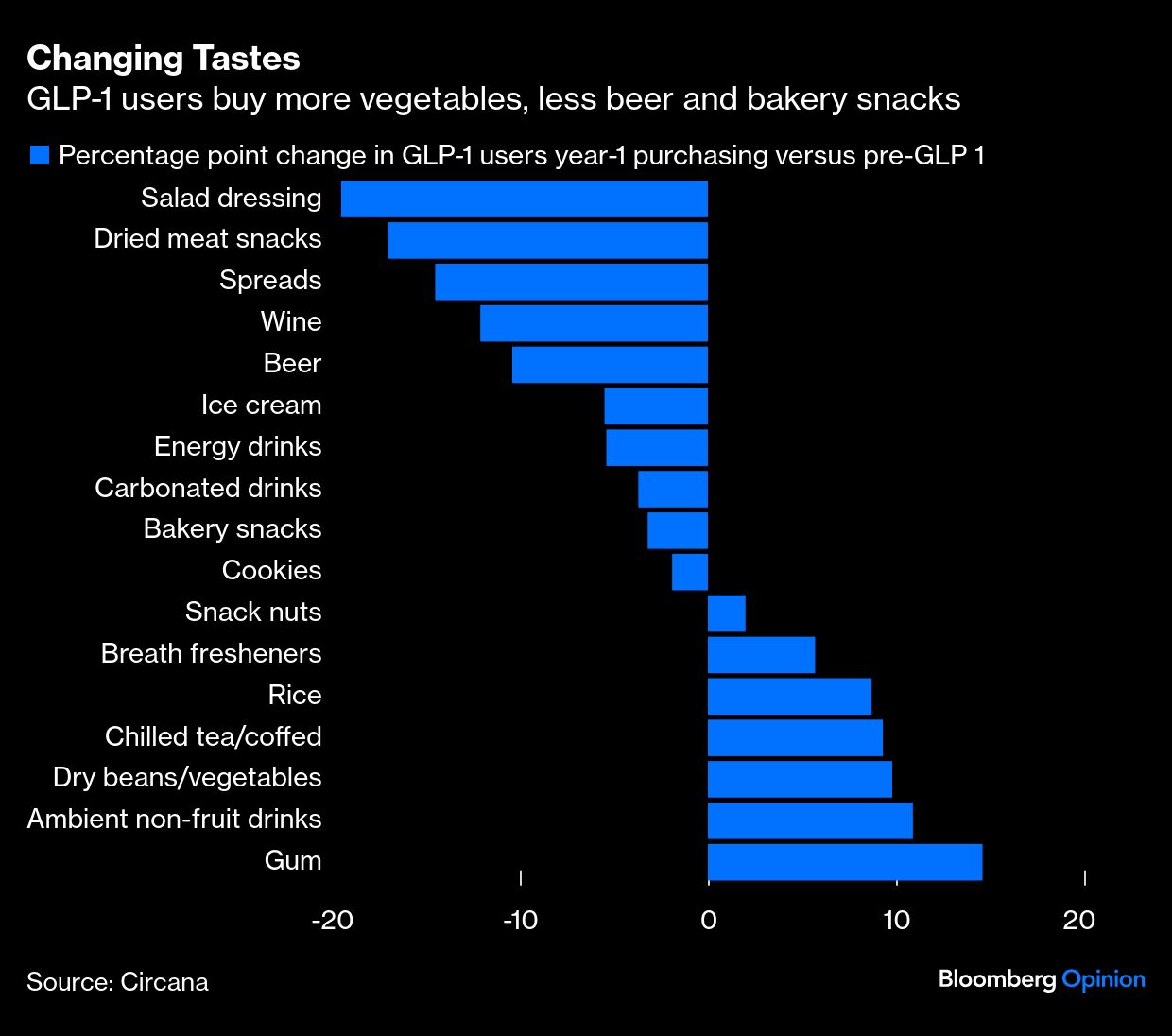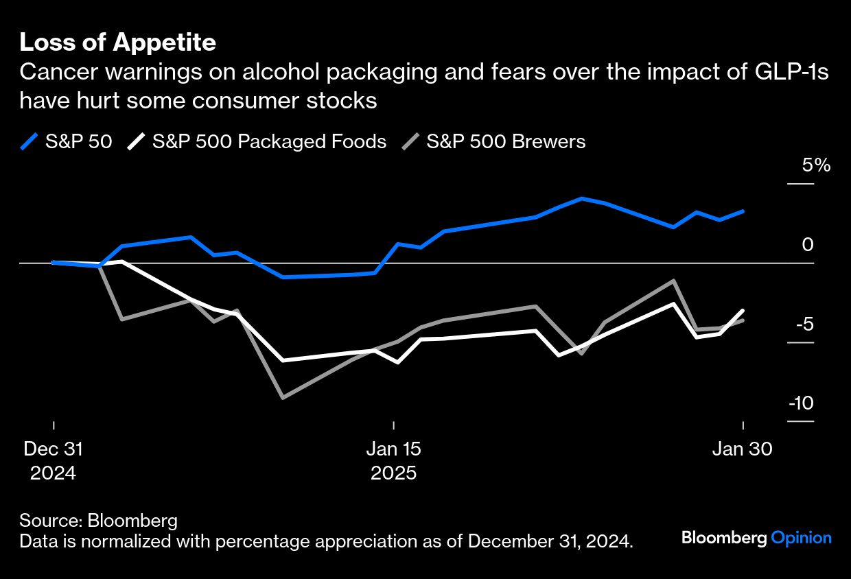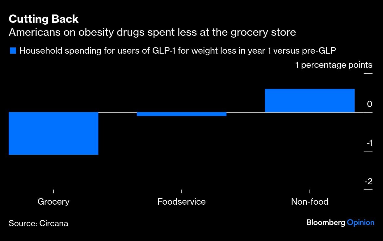 In the US alone, more than 170 million adults are considered overweight or obese. While supply constraints and challenges with insurance coverage have limited access to Novo Nordisk's Wegovy and Eli Lilly & Co.'s Zepbound, a 2024 survey found that one in eight adults in the US had tried a GLP-1. That is already starting to nibble away at supermarket sales. Research company Circana found that although US GLP-1 users continue to outspend non-users on groceries, those taking the drug for weight loss cut their outlay by about 1 percentage point in the first year of the regimen.