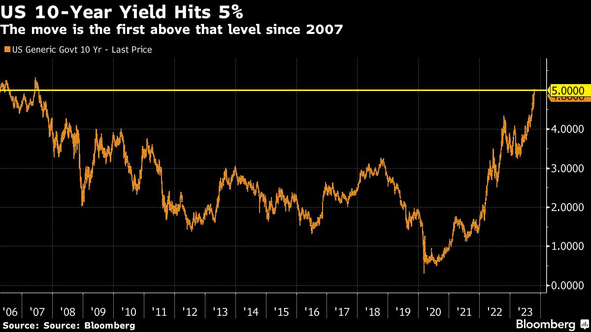 Yields on 30-year Treasuries fell about 5 basis points to 5.03% Monday. They earlier surged as much as 10 basis points to about 5.18%, the highest since 2007, compared with about 4% at the end of July. Ten-year yield fell 2 basis points to about 4.9% after surpassing 5% for the first time in 16 years.