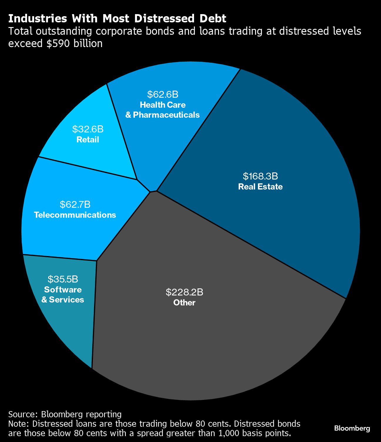 No other industry is facing pressure as acute as commercial real estate due to the slow return to offices that's emptied buildings and thinned out downtowns. More than a quarter of the distressed debt worldwide — or about $168 billion — are tied to the real estate sector, more than any other single group, the data show.