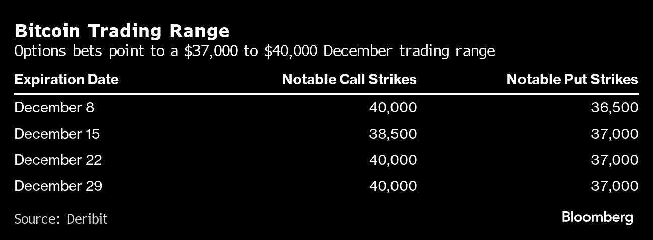 The pattern of positions in the Bitcoin options market hints at a $37,000 to $40,000 trading range in December. The traders selling the bullish call options with a $40,000 strike are clearly willing to take the other side of the wager, indicating that level is going to be a key test area for Bitcoin's resurgence.