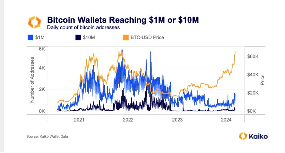 (Bloomberg) -- Bitcoin's record-breaking rally appears to be creating around 1,500 new “millionaire wallets” daily, according to crypto analytics firm Kaiko Research.