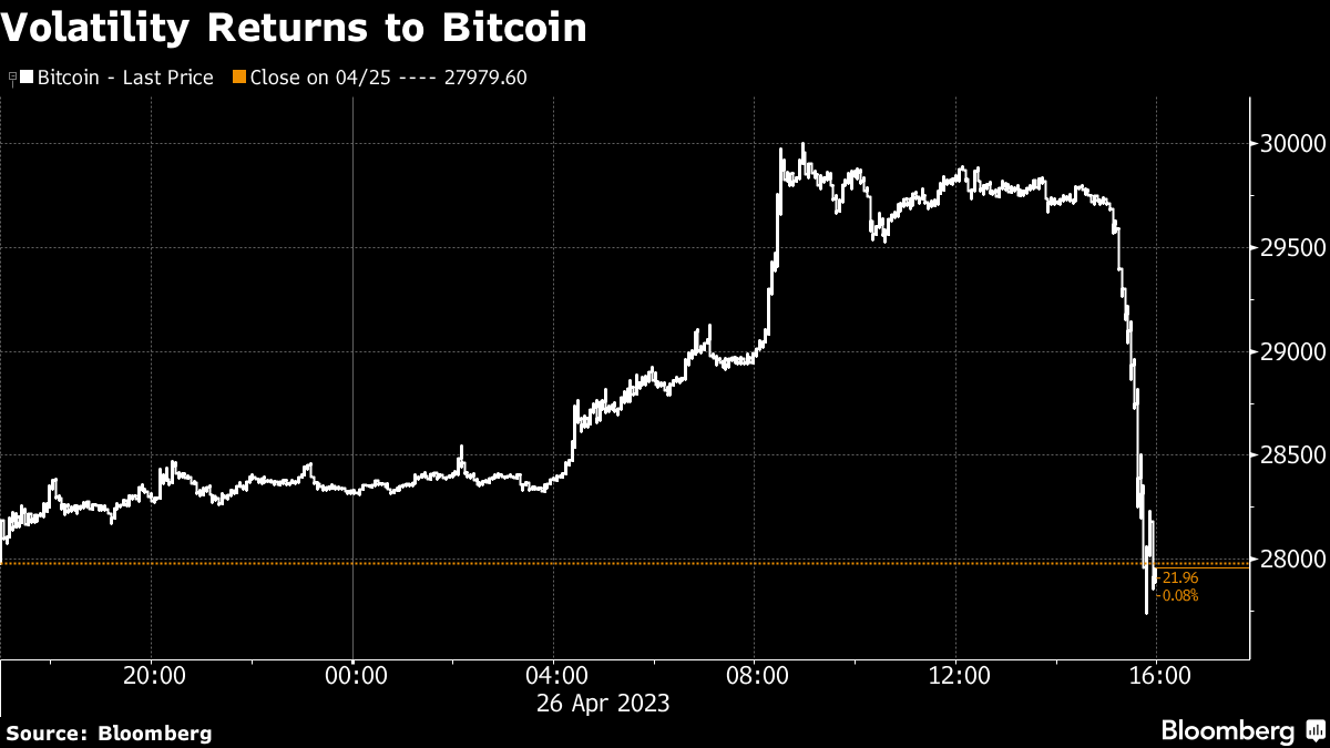 (Bloomberg) -- Bitcoin retreated after briefly climbing back above $30,000 for the first time in a week, reminding investors of the volatility that has long been a key attraction for many traders.
