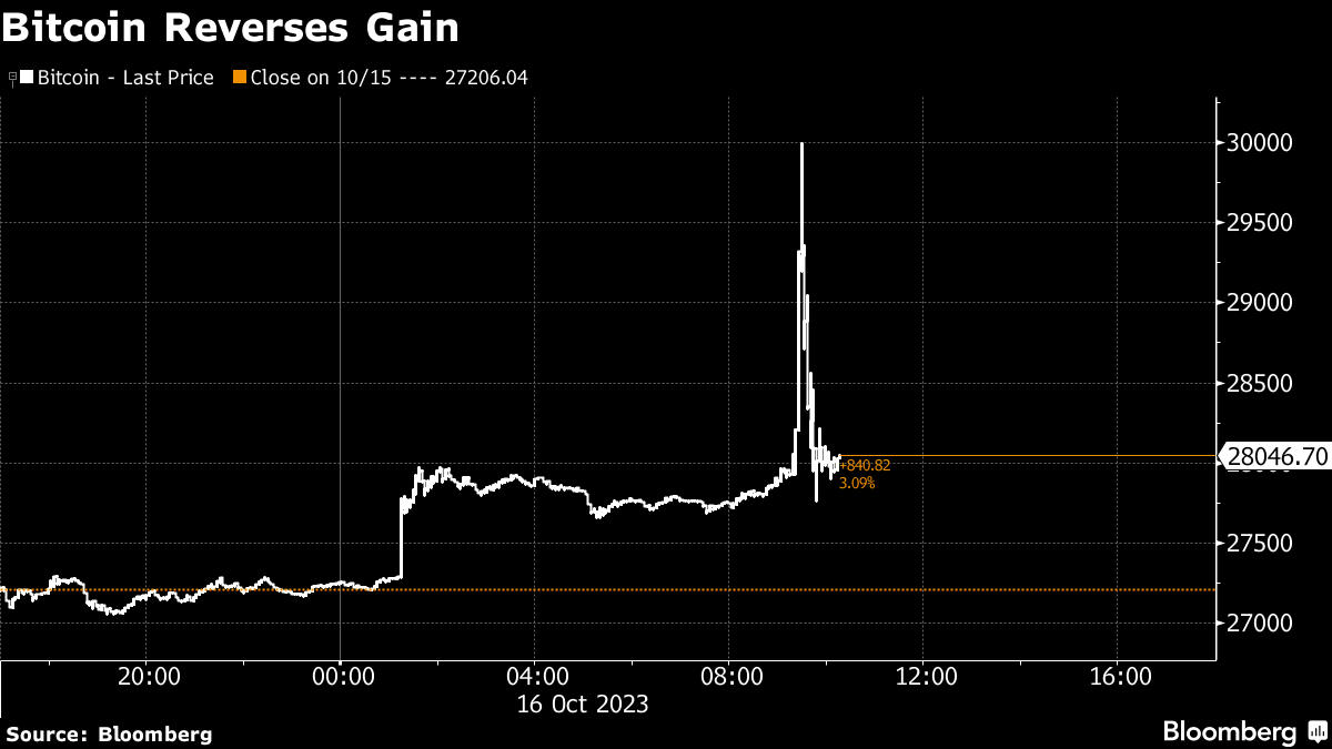 Speculation swirled on social media that BlackRock, which in June submitted an application for a spot-Bitcoin ETF, received a green-light from the US Securities and Exchange Commission to launch the first such product in the US. That spurred the surge in the largest coin, though Bitcoin quickly reversed the majority of those gains after the rumor was debunked.