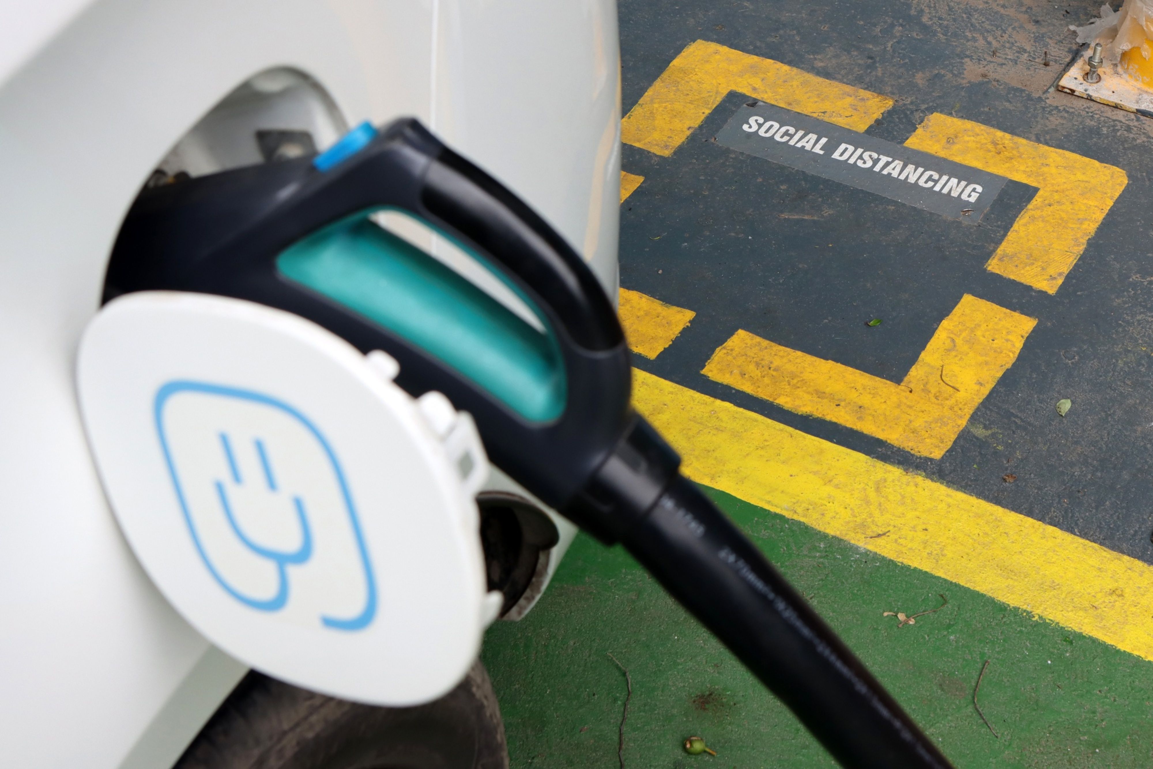 A charging plug is connected to an electric vehicle. (Photographer T. Narayan/Bloomberg)