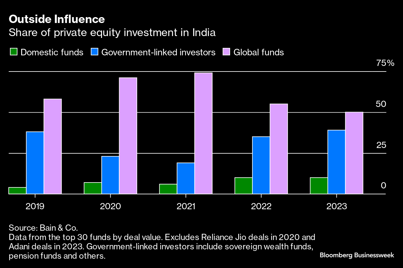Although India has an expanding crop of homegrown private equity firms, they struggle to compete with the global giants, whose deeper pockets let them buy bigger, stronger businesses and better weather economic ups and downs. And the bigger firms' experience in and access to other markets helps them take their portfolio companies beyond India, pooling resources to boost their success. In recent years, international companies have accounted for as much as three-quarters of PE investments by top funds in India, Bain says. “India has become a two-track private equity market of haves and have-nots,” says Sunaina Sinha, global head of the private capital advisory group at Raymond James Financial Inc. “It is dominated by global funds.”