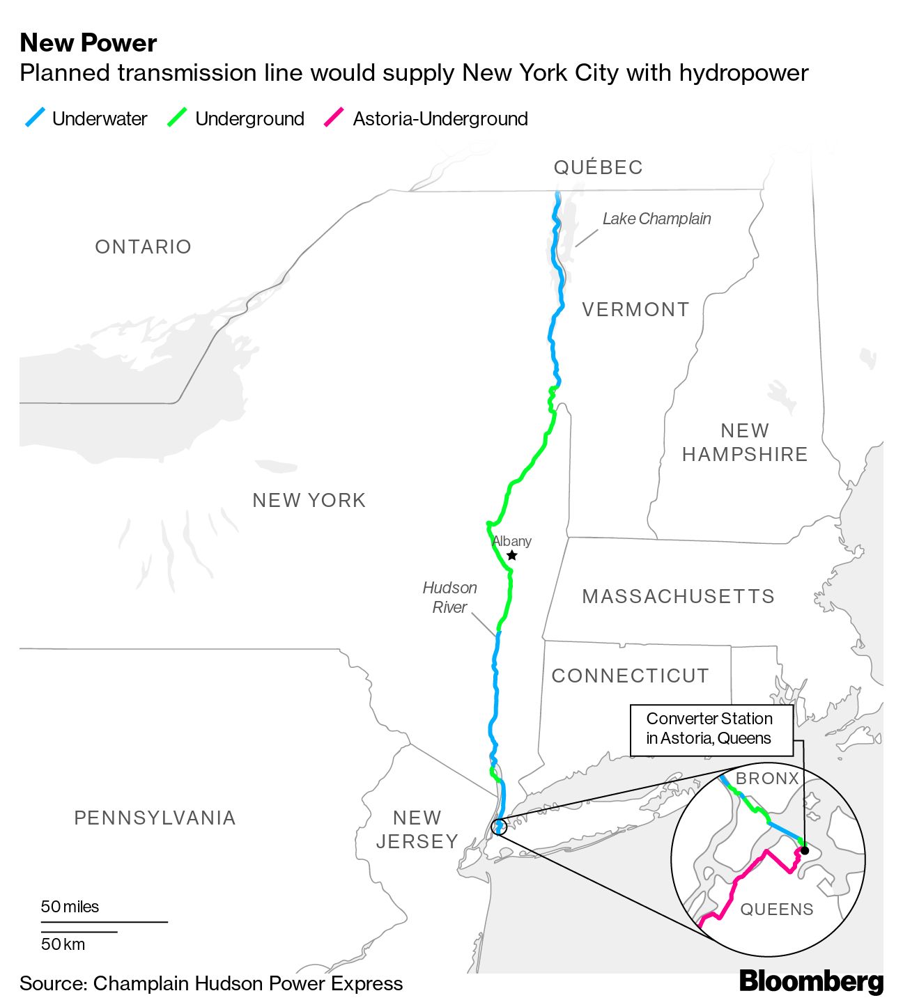 The 339-mile (546-kilometer) transmission line, stretching from Quebec to Astoria, Queens, will run under parts of the Hudson River and deliver 1,250-megawatts of hydroelectricity -- enough to power more than 1 million homes.Â