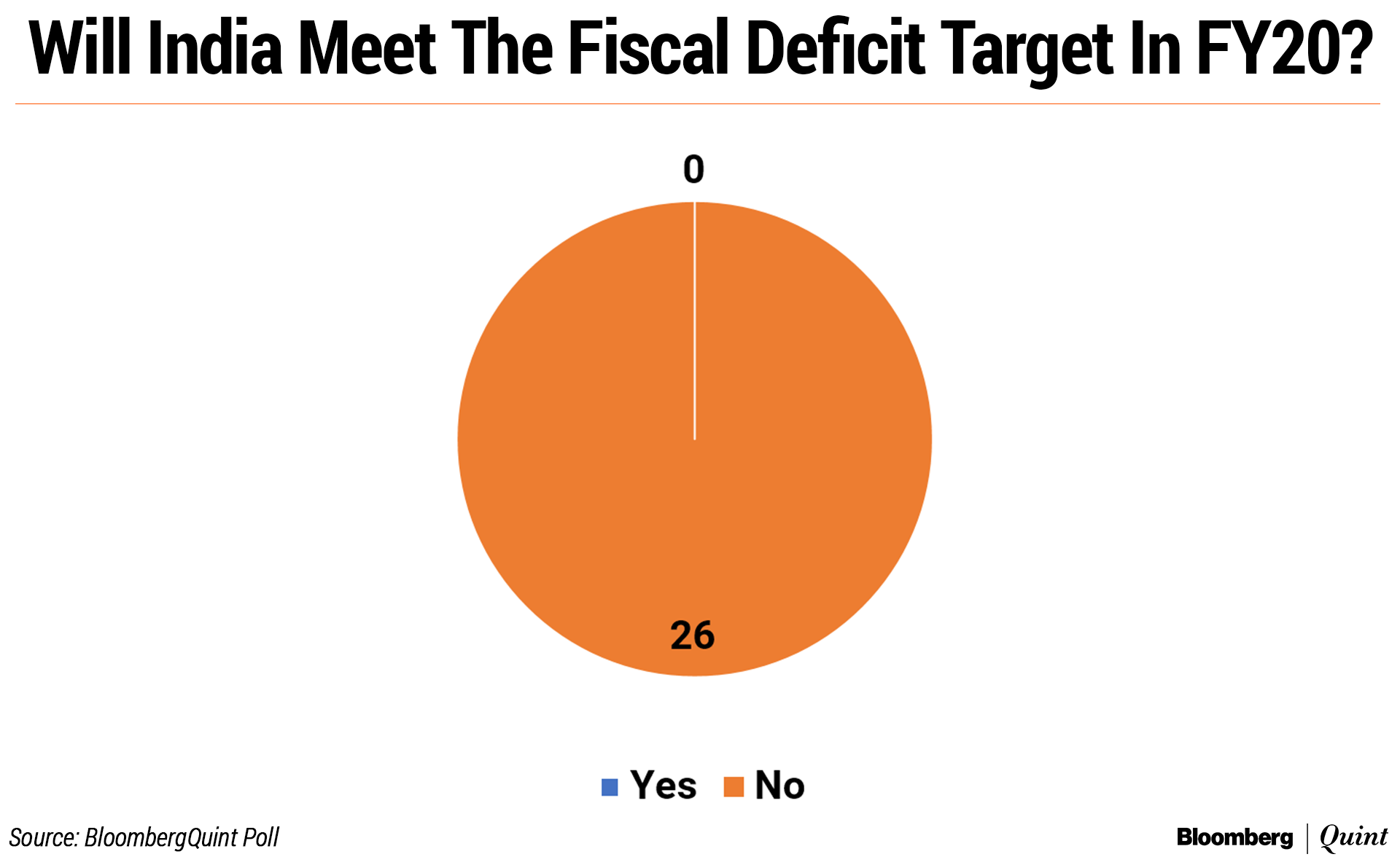 None of the respondents expect India to meet the FY20 fiscal target of 3.3 percent. And they expect FY21 fiscal deficit higher at 3.5 percent.