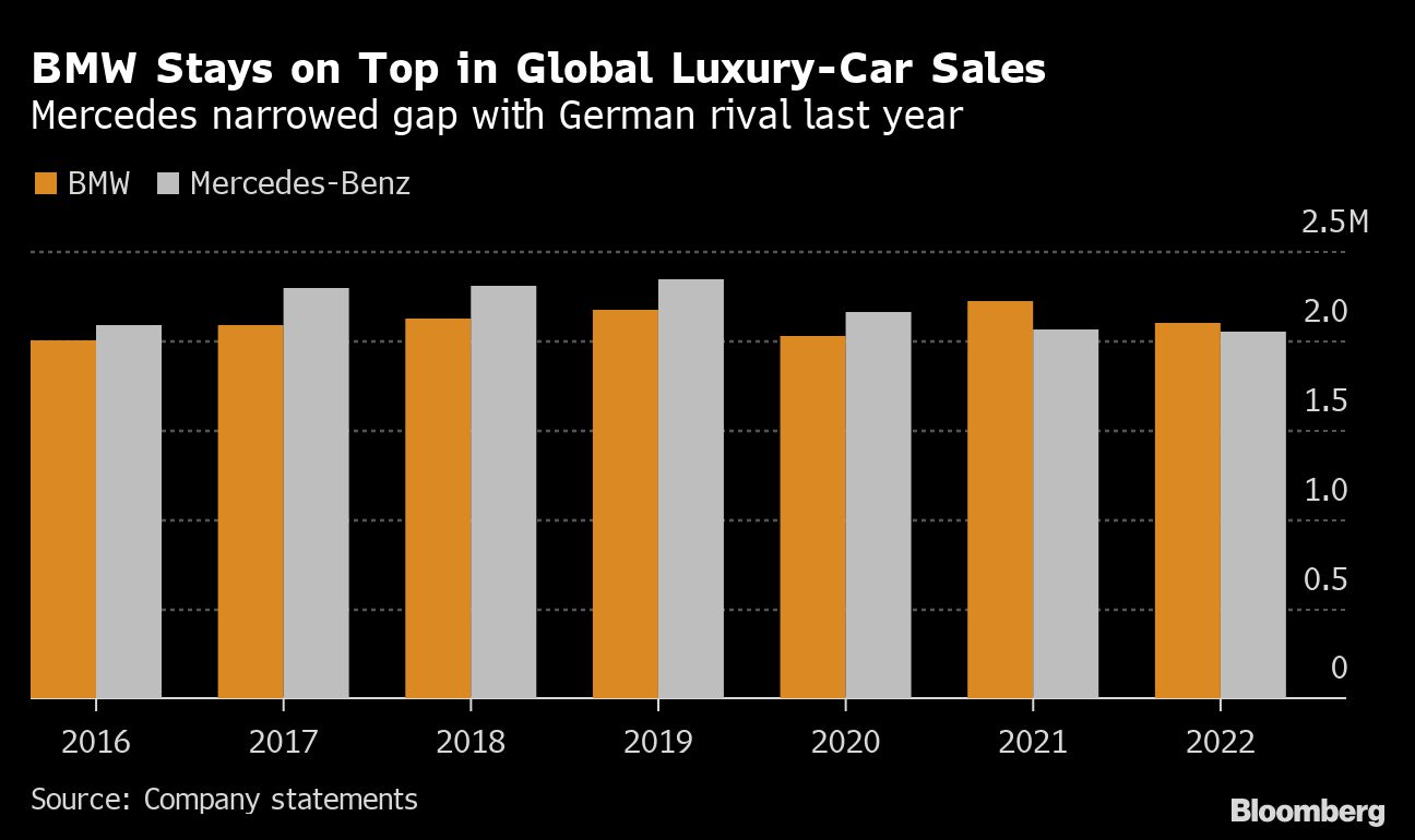 Worldwide deliveries of BMW-branded cars fell 5% to 2.1 million last year, edging out Mercedes, whose shipments slipped 1% to 2.04 million. While both brands grew sales in the final months of 2022, they couldn't compensate for business lost during the first half, when parts shortages and the war in Ukraine crimped output.