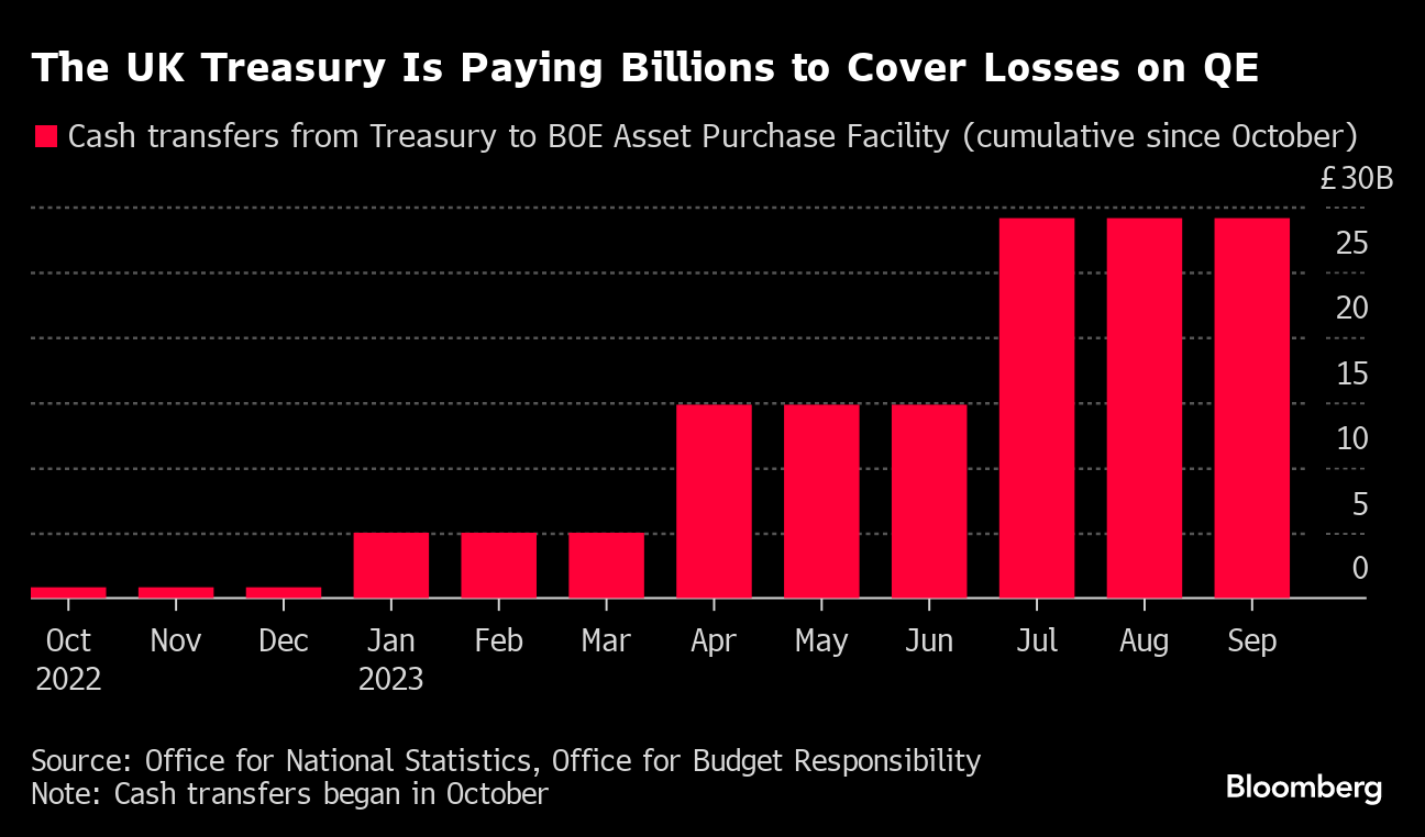 (Bloomberg) -- UK Chancellor of the Exchequer Jeremy Hunt will have about £10 billion ($12.3 billion) less for public services or tax cuts in his autumn statement this month as a result of the Bank of England selling off government bonds it bought under quantitative easing, according to economists.