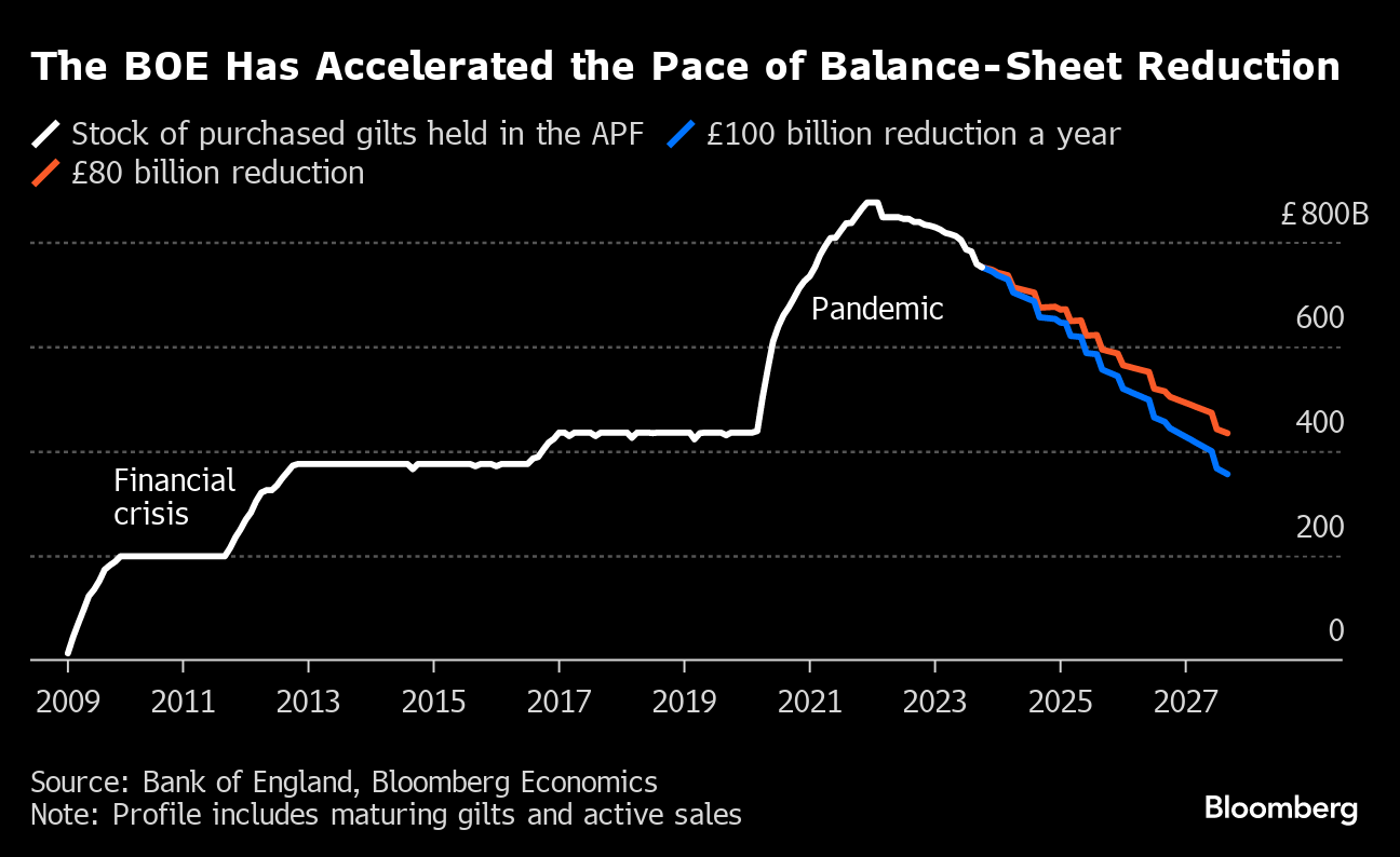 In September, the BOE decided to increase the pace of annual gilt reduction, through both sales and maturities, from £80 billion to £100 billion a year. That creates an extra £5 billion of losses a year over the next parliamentary term, according to the central bank.
