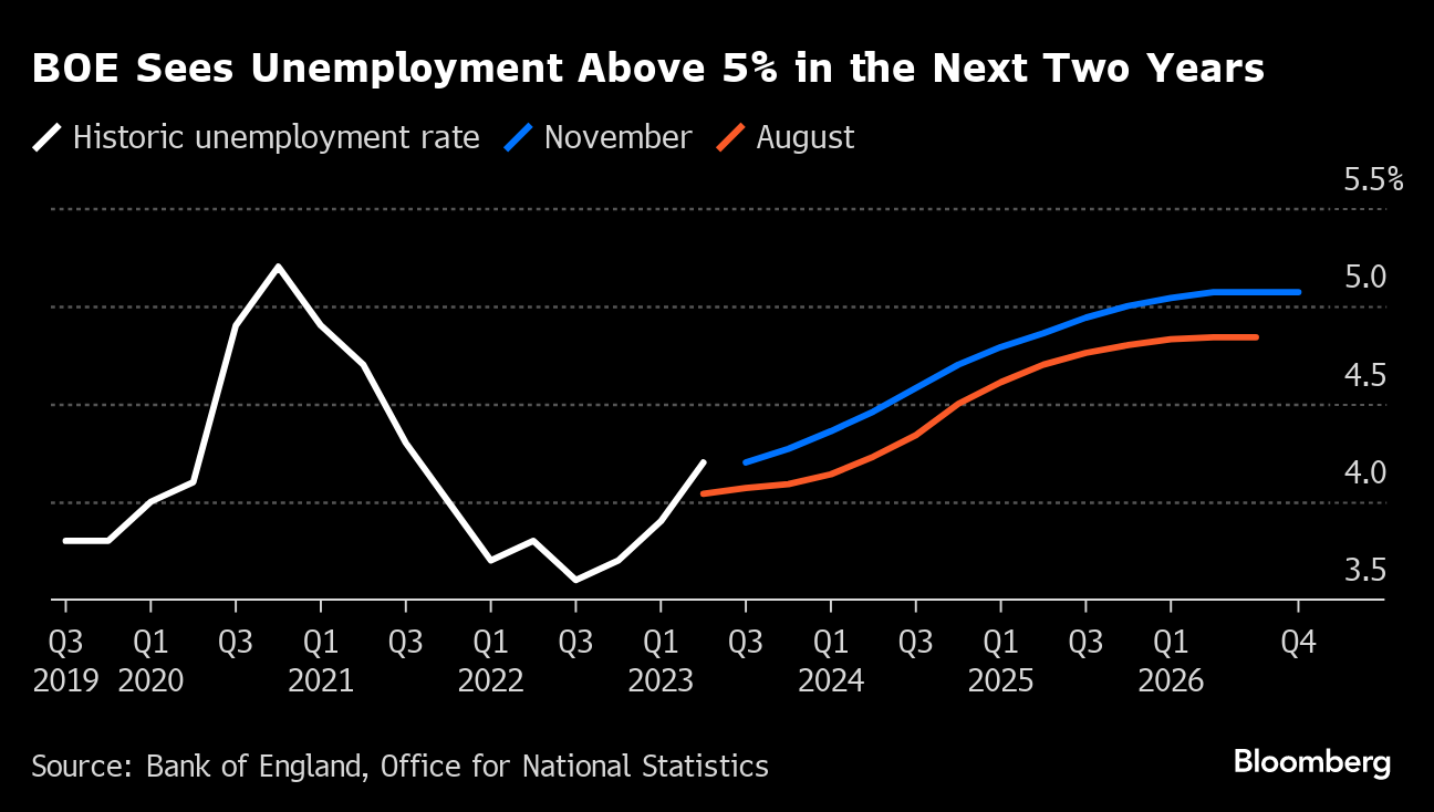 The BOE downgraded growth alongside its rate decision. GDP will be “broadly flat,” with zero growth projected in 2024, down from the 0.5% expansion previously expected. A paltry 0.25% gain is penciled in for 2025.