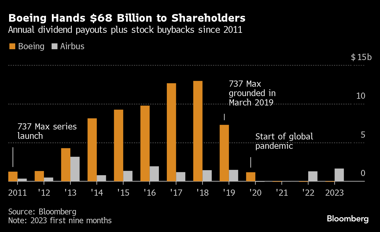 At the same time that Boeing was reworking its supplier network, executives put greater focus on propping up the share price with the help of dividends and buybacks. Since 2011, the year the 737 Max was officially announced, Boeing has handed some $68 billion to shareholders in the form of dividends and stock buybacks, according to data compiled by Bloomberg, though it suspended the measures as its financial crisis deepened. Airbus, by comparison, has been much more conservative with its balance sheet, giving it greater resources to respond to the pandemic.