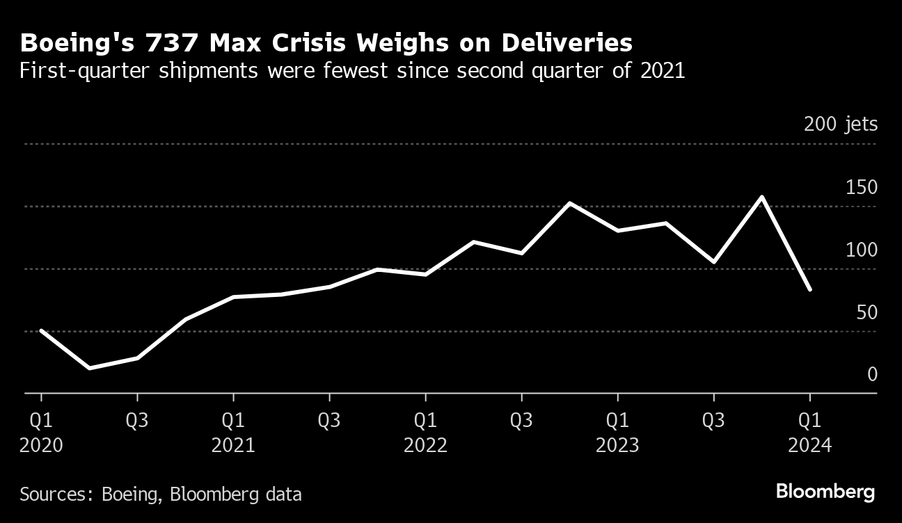 (Bloomberg) -- Boeing Co. deliveries in the first quarter were the lowest since mid-2021, highlighting how far the planemaker has to go on its road to recovery from a near-catastrophic accident early in January.