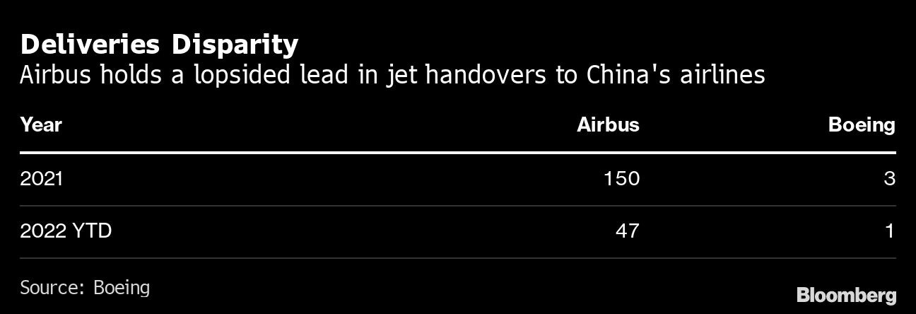 At the market's peak in 2018, China took around 350 jets in a single year, notes Richard Aboulafia, analyst with AeroDynamic Advisory. By prioritizing China's deliveries, Airbus could further squeeze Boeing, he said.