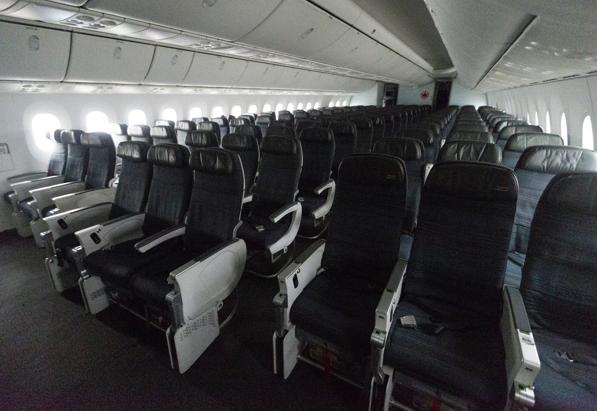 The interior of Boeing 787 Dreamliner at Montreal-Pierre Elliott Trudeau International Airport (YUL) in Montreal, Quebec, Canada.