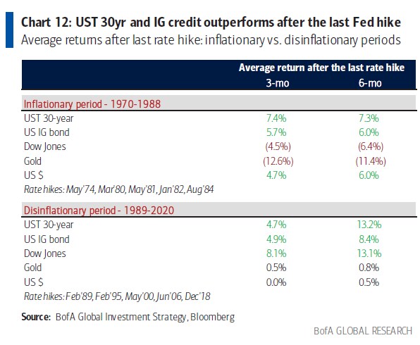 An analysis by Michael Hartnett and his team showed that stocks outperformed after the Fed stopped increasing rates during periods of disinflation in the past 30 years. However, during the era of persistently high inflation in the 1970s and 1980s, equities had fallen after the last hike, they wrote in a note. In the current cycle, they expect the Fed to raise rates for the last time in March 2023.