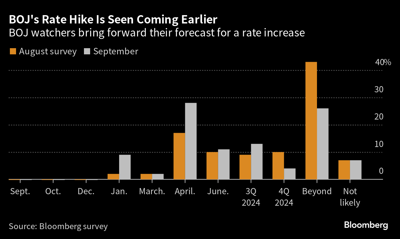 Last month, 31% predicted a rate hike within that time frame. Some 9% of respondents in the latest survey see the BOJ adjusting or discarding its yield curve control mechanism in October.