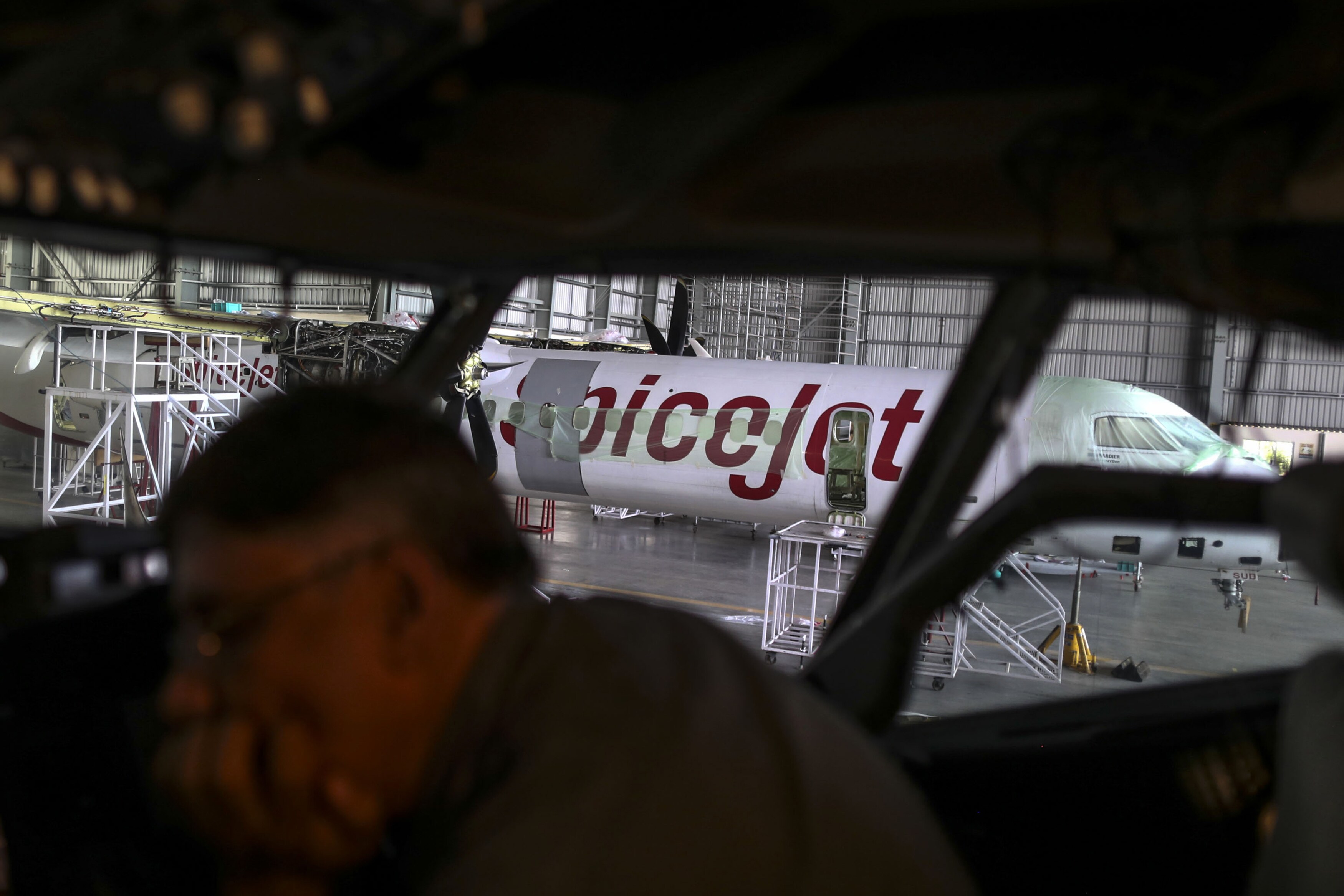 A Bombardier Inc. Q400 NextGen passenger aircraft undergoing maintenance is seen through the windshield of a Boeing Co. 737-8GJ aircraft at the Air Works Engineering Pvt. hangar in Belagondapalli, Tamil Nadu (Photographer: Dhiraj Singh/Bloomberg)