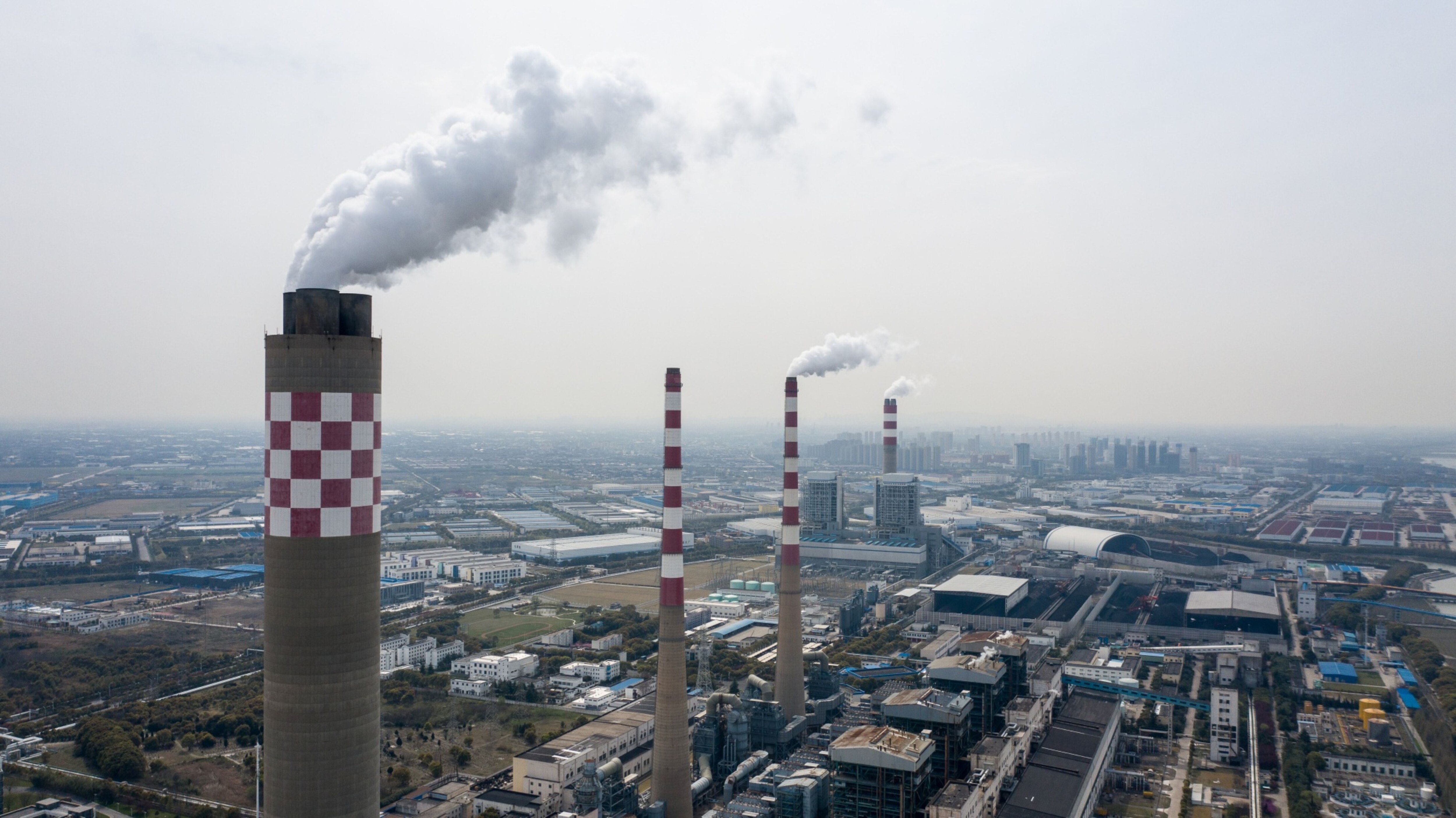 Exhaust rises from the smoke stacks of thermal power plants in this aerial photograph taken in Changshu, Jiangsu Province, China (Photographer: Qilai Shen/Bloomberg)