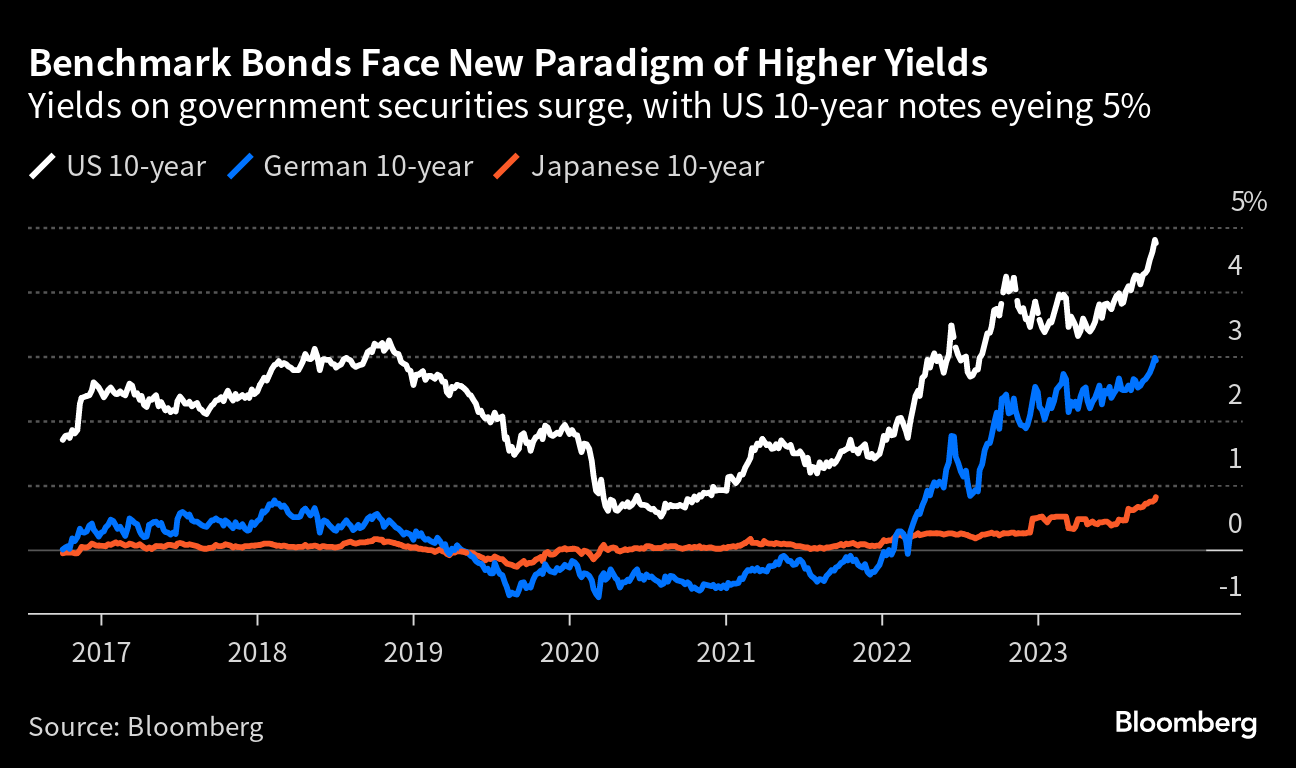 Put all these together and the price of money has to go up. And this new, higher level portends major changes across the financial system and the economies it feeds. Some money-market funds and even bank deposits are now offering a 5% handle. The German 10-year yield is at the highest since 2011, while even Japan's is at a level not seen in a decade.