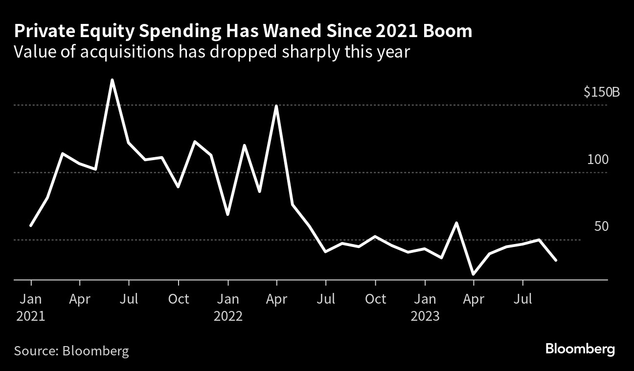 Private equity firms have been particularly affected, with the value of their acquisitions falling 45% this year to about $384 billion, the second consecutive year of double-digit percentage declines.