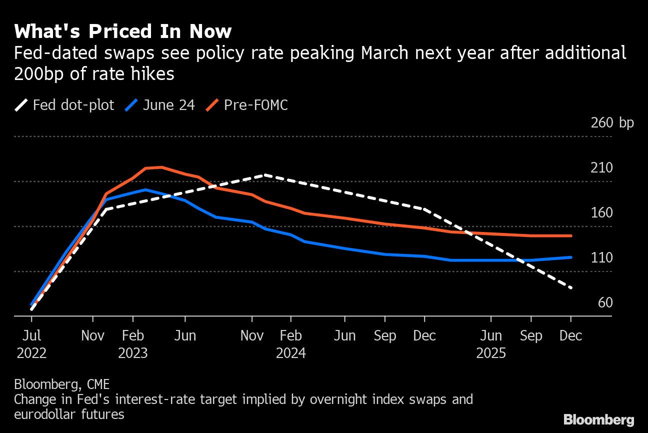 What traders seem slow to accept is that markets have entered a new regime, and inflation is no longer a benign force in the background. The old playbook of well-telegraphed and gradual central bank moves guiding the markets gently toward a predetermined goal post won't work when the goal post keeps shifting. My Bloomberg News colleague at Markets Live Ven Ram provided a good estimate of just how much the goal post has shifted, based on the Fed's own rules. Powell said that by the end of the year, the Fed's policy rate “will be pretty close to where some of the Taylor Rule iterations are.” That's 4.93% based on current estimates, or more than 3 percentage points above the current fed funds rate. The market is only pricing another 1.75 percentage points of rate increases between now and December. The Fed's “dot plot” shows even less tightening.