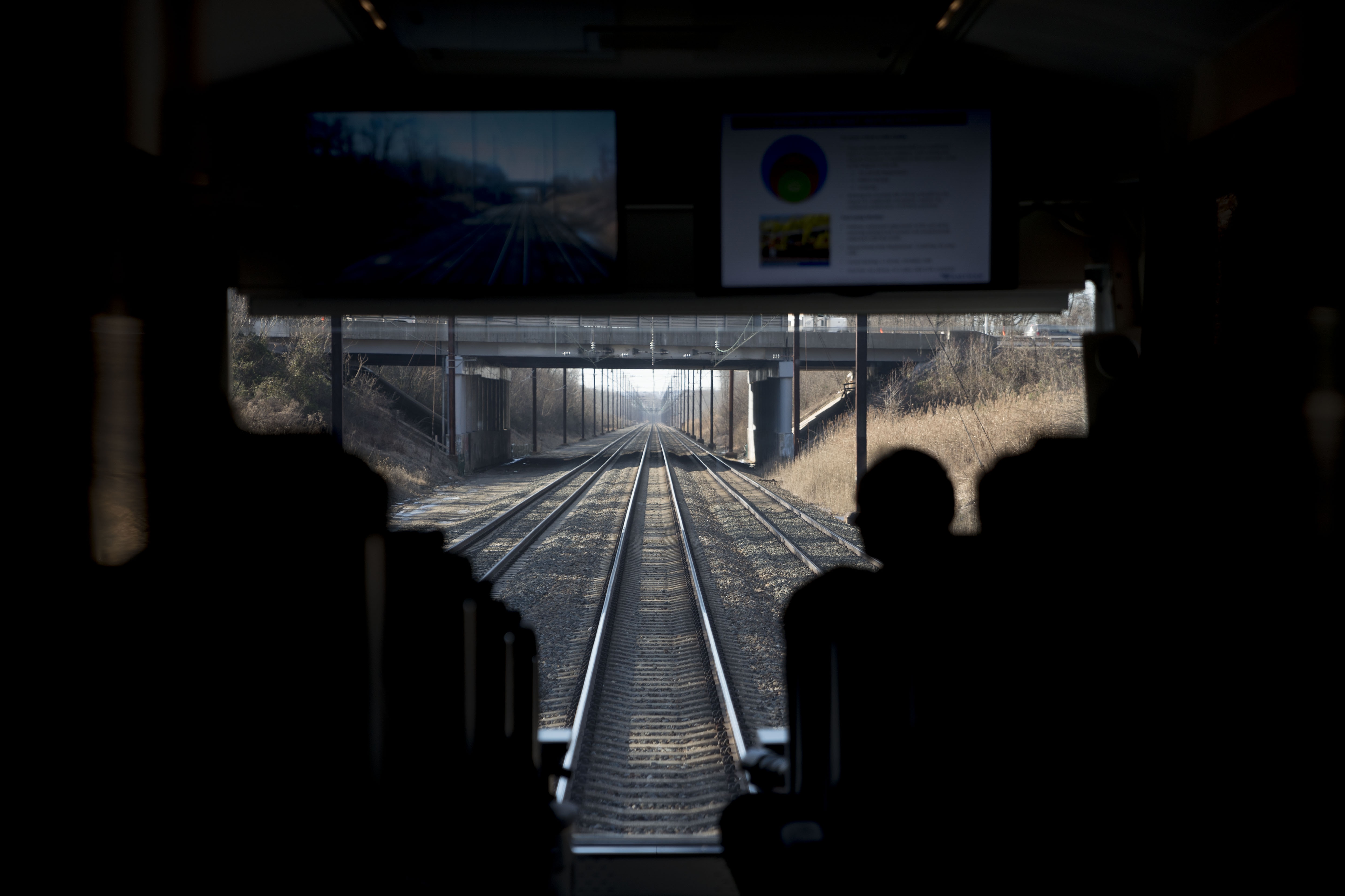 Tracks are seen in front of a train car (Photographer: Andrew Harrer/Bloomberg)