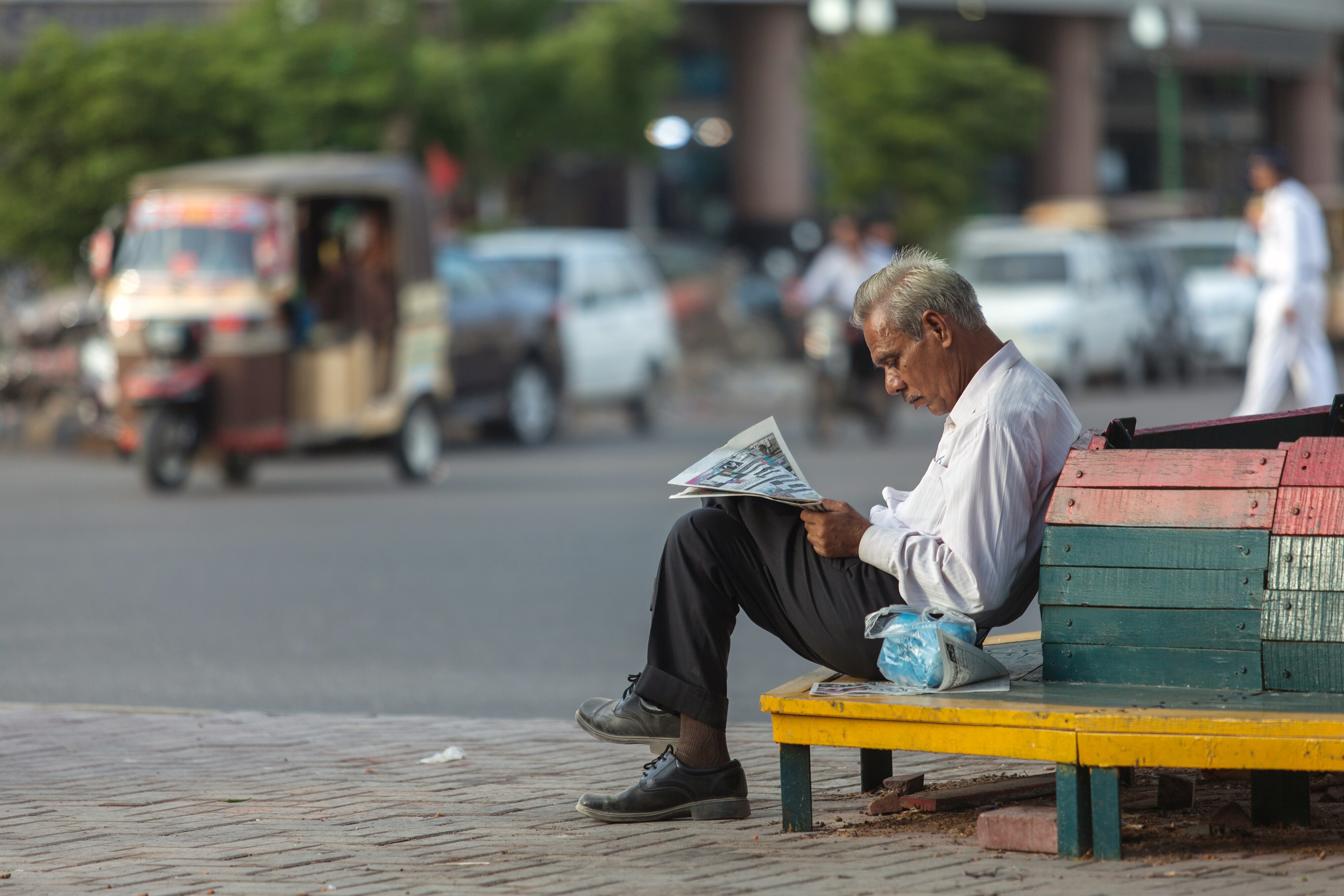A man reads a newspaper while sitting on a bench at the side of a road (Photographer: Asim Hafeez/Bloomberg)