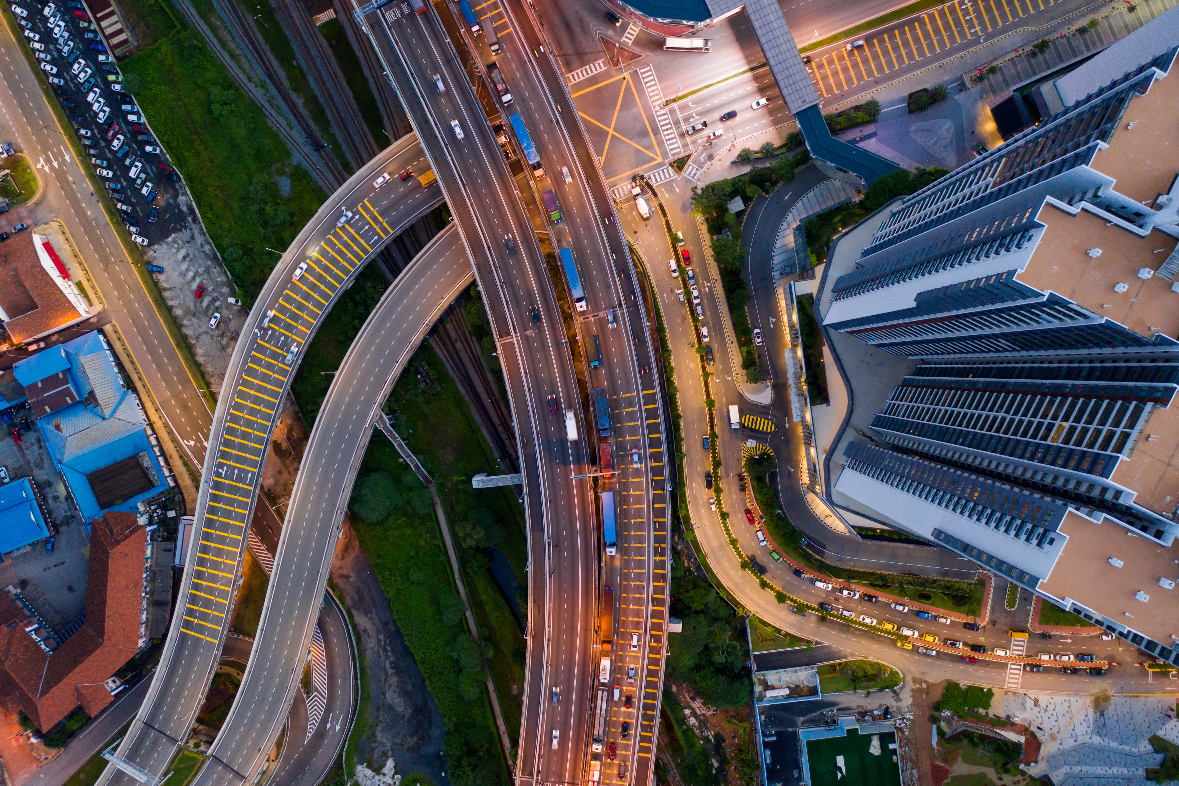 Vehicles travel along a road at dawn in this aerial photograph taken above Johor Bahru, Johor, Malaysia (Photographer: SeongJoon Cho/Bloomberg)