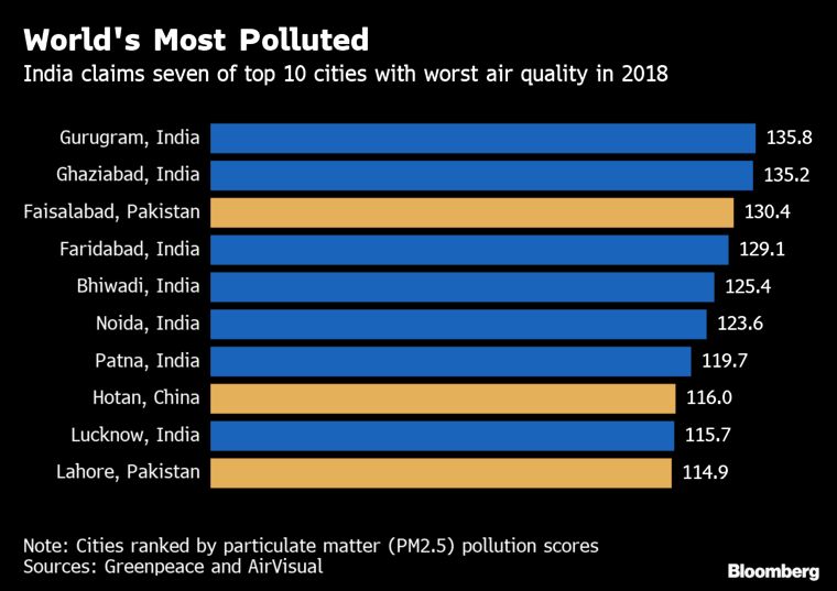 - Gurugram, located southwest of India's capital New Delhi, led all cities in pollution levels in 2018, even as its score improved from the previous year, according to data released by IQAir AirVisual and Greenpeace.