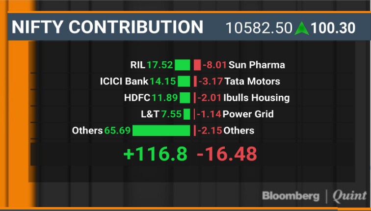 - The NSE Nifty 50 Index rose 100 points or 0.96 percent higher at 10,582.