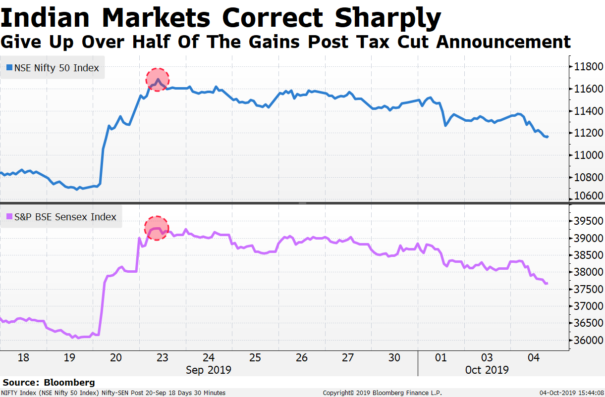 • The Nifty 50 index, which surged to a two-month high of 11,600 on Sept. 23 after the tax bonanza, is now below 11,200.
