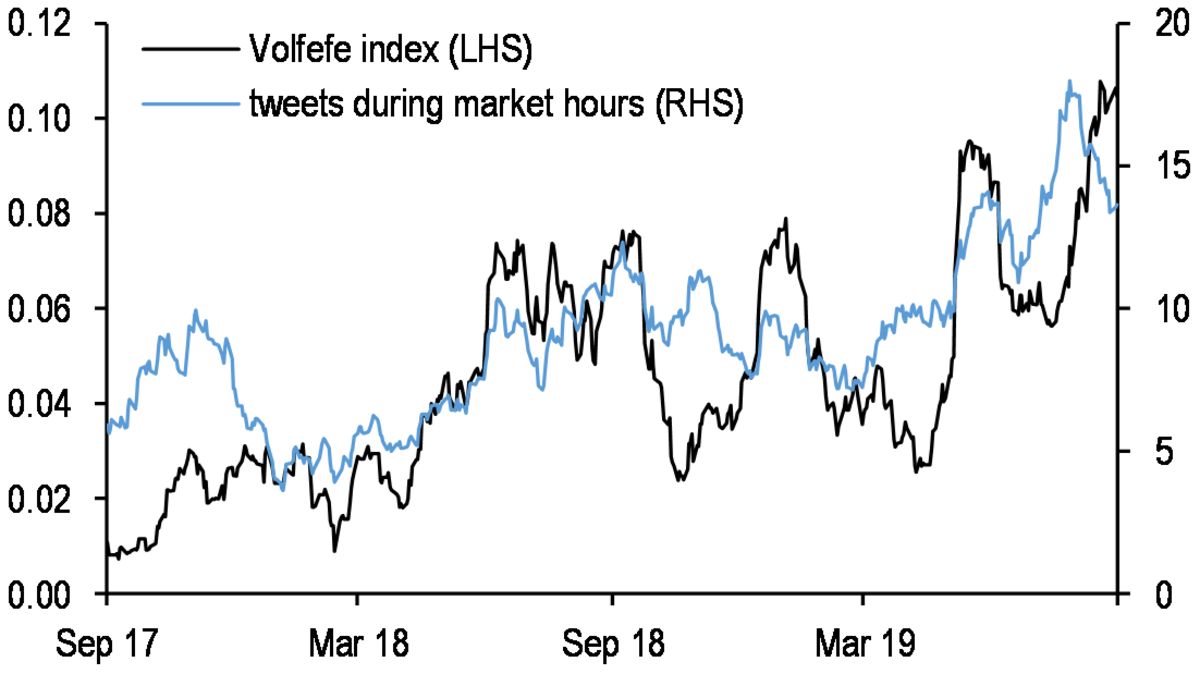 - The number of market-moving Trump tweets has ballooned in the past month, with those including words such as ‘China,' ‘billion,' ‘products,' ‘democrats,' and ‘great,' most likely to affect prices, the analysts found.