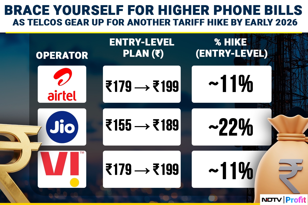 “A tariff hike is imminent. We expect jump to be less than last year, less than 15–20%… Going forward, the trend of price hikes will be more frequent than a bi-yearly exercise,” an ICRA analyst said, adding that average revenue per user could climb from Rs 200 in fiscal 2025 to Rs 220 in fiscal 2026.