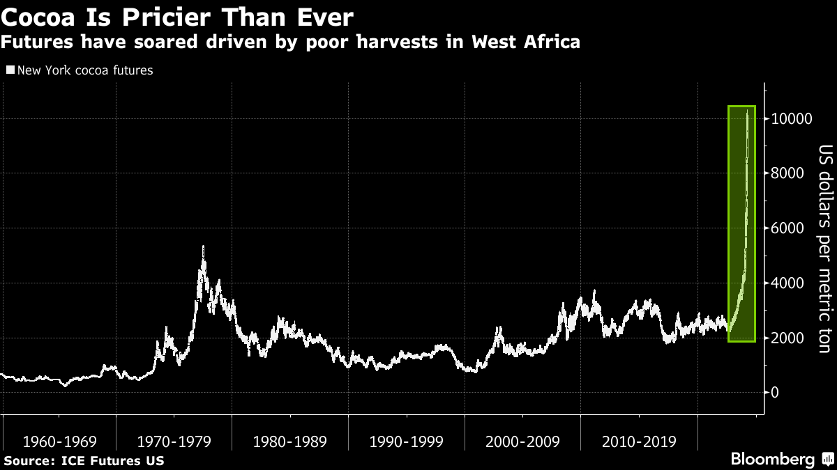 Cocoa prices have more than doubled this year to a record as extreme weather, disease and structural issues have hurt supplies from Ivory Coast and Ghana. Cocoa futures in New York settled at $9,312 per ton on Friday, climbing roughly 3%. Low pay has hampered farmers' ability to invest in improvements, limiting how much cocoa their trees can yield. That's bringing more global attention to Brazil, which has plenty of agricultural know-how and farmers with financial resources to invest in new crops.