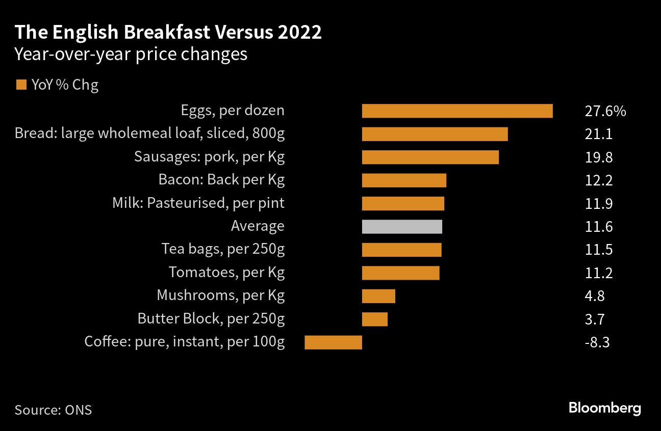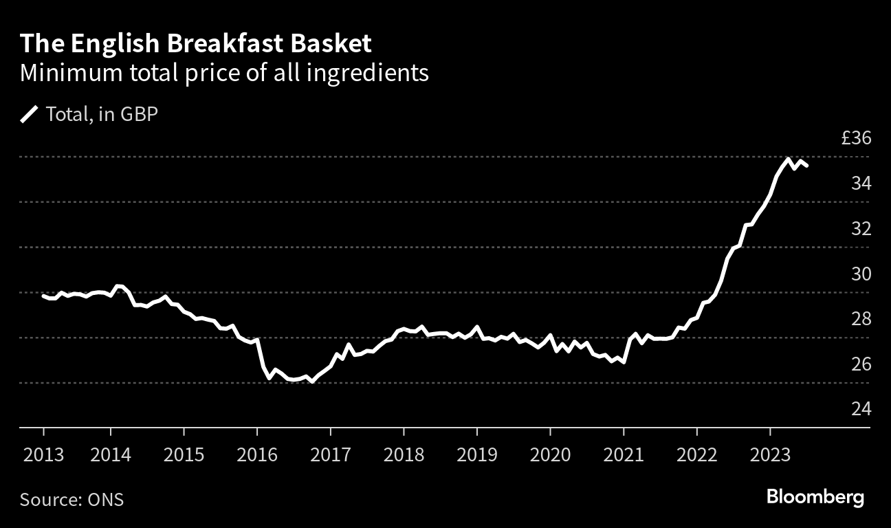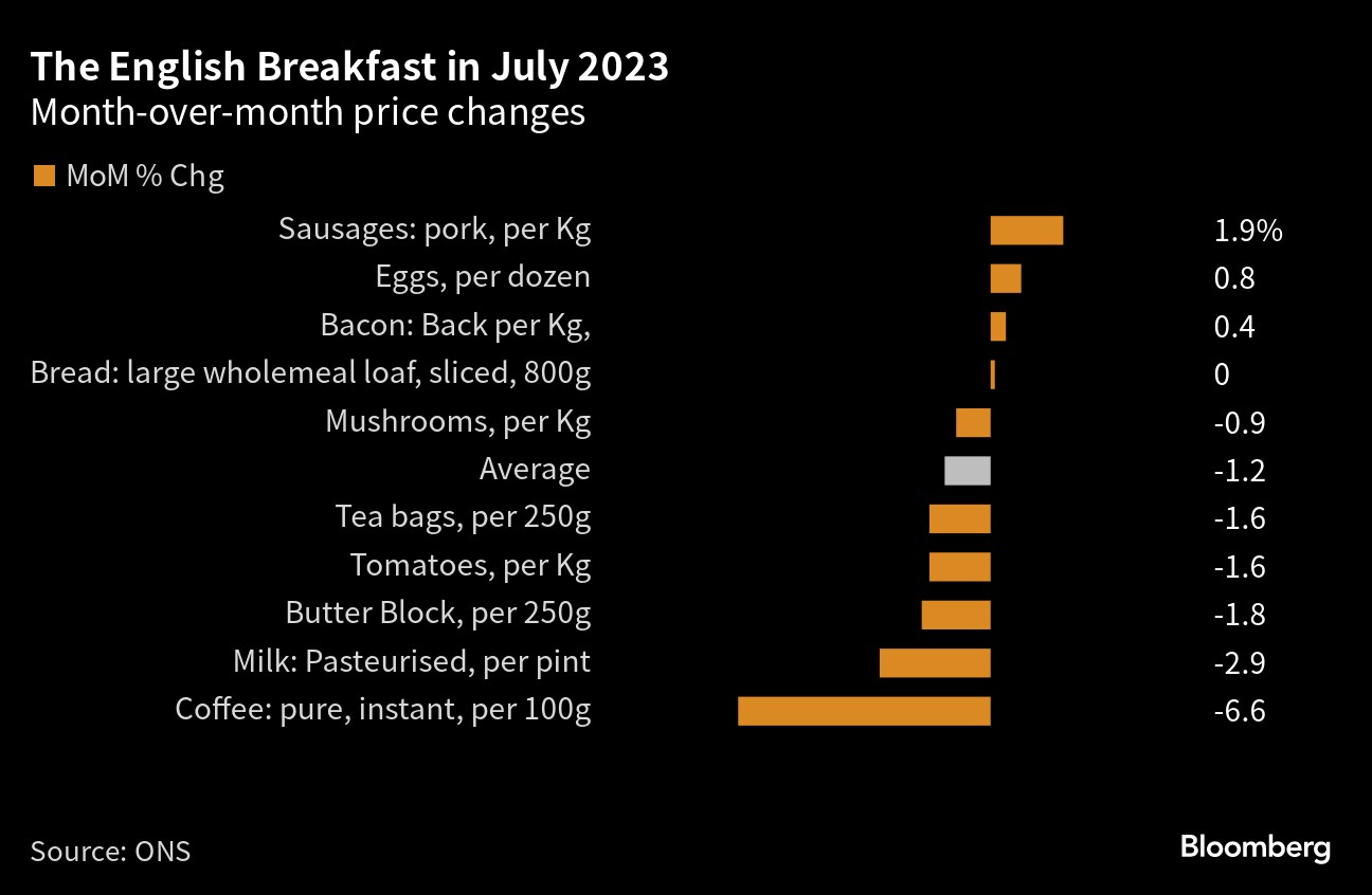 Still, double-digit food inflation is weighing on shoppers and Bloomberg's index shows that most elements of the English breakfast were more costly in July than a year earlier.