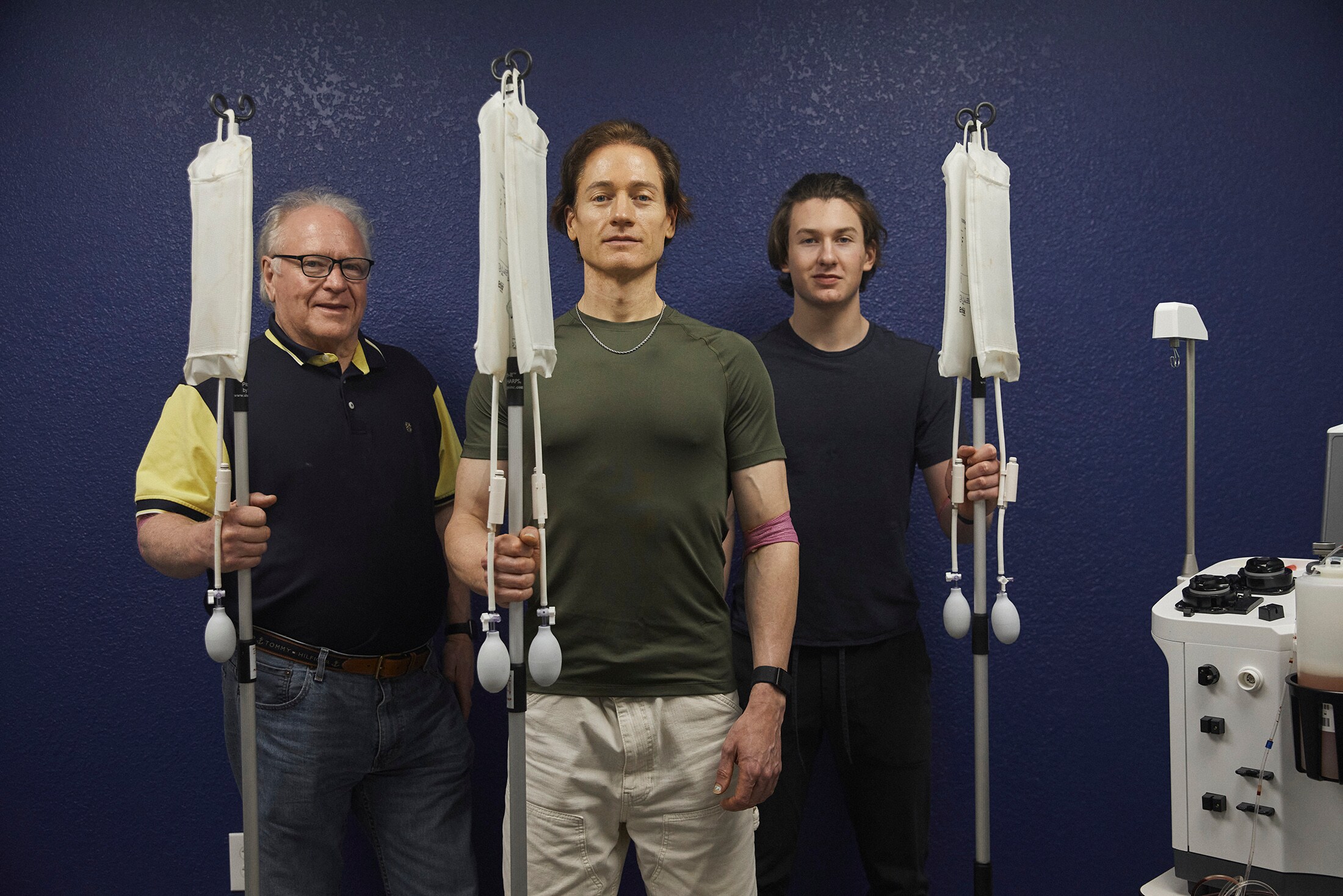 Talmage goes first, having a liter of his blood removed and converted via a machine into its piece parts—a batch of liquid plasma and then a batch of red blood cells, white blood cells and platelets. Bryan next undergoes the same process and then has an additional procedure in which his son's plasma is fed into his own veins. Richard goes last and receives Bryan's plasma after making room for the fluids by having his own blood drained.