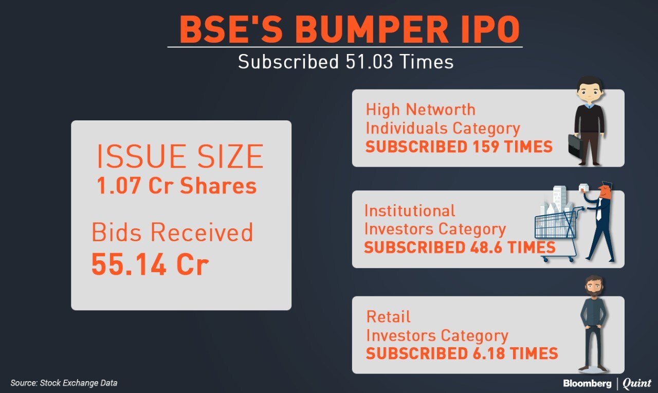 The Bombay Stock Exchange Ltd. (BSE) IPO received bids for 55,14,14,862 shares as against the book size of 1,07,99,039 shares, according to data available on the National Stock Exchange.