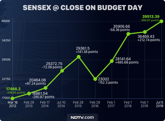 On July 5, 2019, Finance Minister Nirmala Sitharaman presented the first budget of Prime Minister Narendra Modi's government after its return to power in general elections held in May. The Sensex fell as much as 1.17 per cent during the session before ending 0.99 per cent lower for the day. That was followed by a further 2.01 per cent drop in the index on the next day.