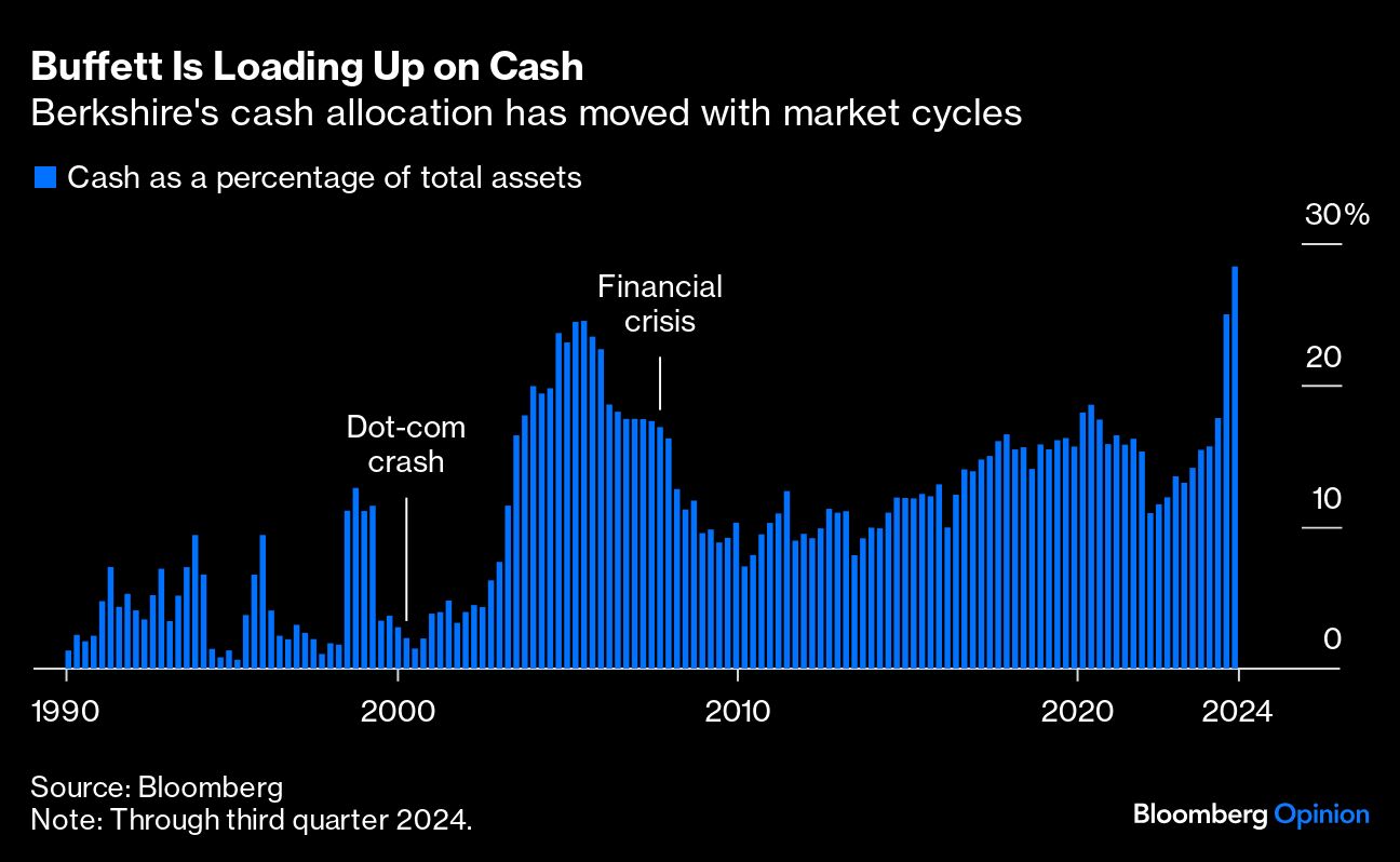 But those moves have been overshadowed by Berkshire's $325 billion cash hoard, nearly double the company's cash balance at year end, and the most Buffett has ever amassed. It also comes at a time when Buffett's favorite valuation gauge — a ratio of the stock market's value relative to the size of the US economy – is at a record high.