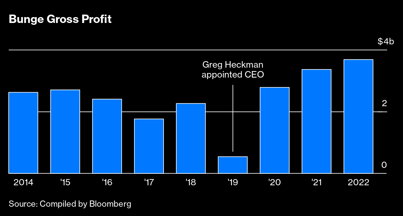 But trading is a tough business with thin margins and high risks. In 2018 a bet on soybeans that went bad because of the US trade war with China led to a surprise quarterly loss, fueling a 20% drop in Bunge's stock and a push by activist investors at D.E. Shaw & Co. and Continental Grain Co. to force change. The board soon ousted Chief Executive Officer Soren Schroder and replaced him with Greg Heckman, who has cut costs, sold underperforming businesses, focused on risk management and kick-started growth. “This team came in with a pretty clear vision of wanting to shed noncore or unproductive assets,” says Stephens Inc. analyst Ben Bienvenu.