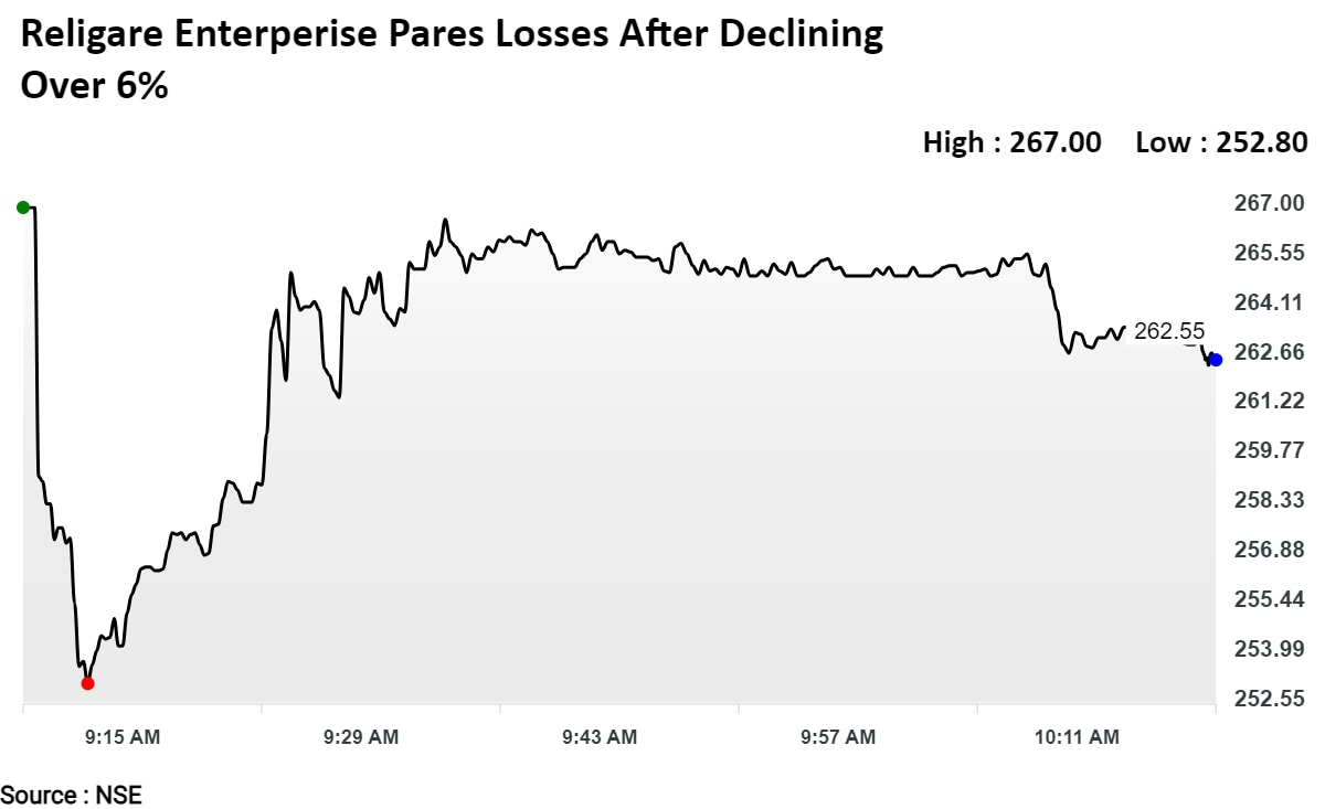 Shares of Religare Enterprises declined 6.90% intraday, the most since Sept 12. The stock pared some of the losses to trade 3.04% lower at 263.30 apiece at 10:20 a.m. compared to a 0.24% decline in the NSE Nifty 50.