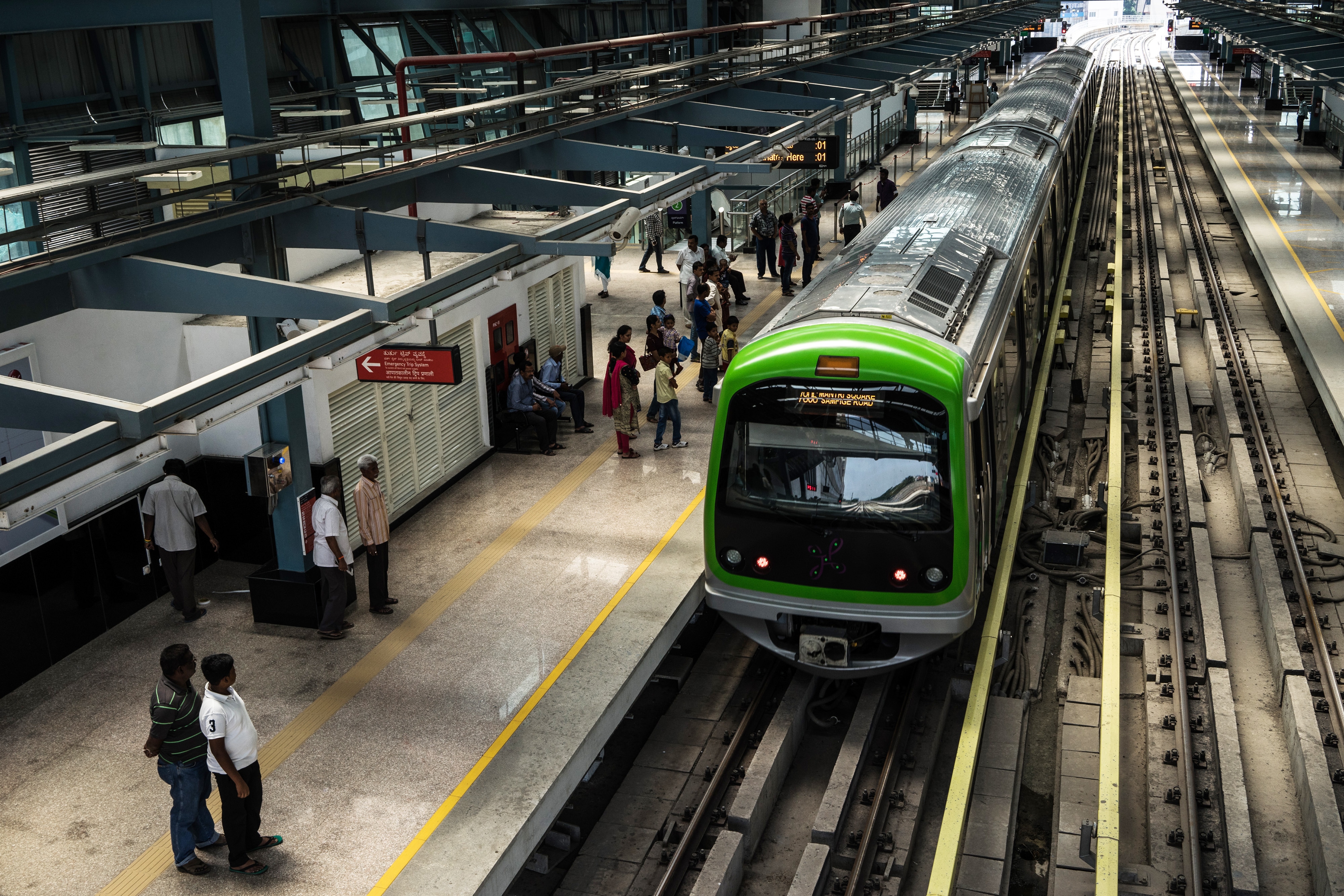 Passengers wait to board a train at Mantri Sampige Square Metro station, operated by Bangalore Metro Rail Corp. (BMRCL), in Bengaluru. (Photographer: Sanjit Das/Bloomberg)