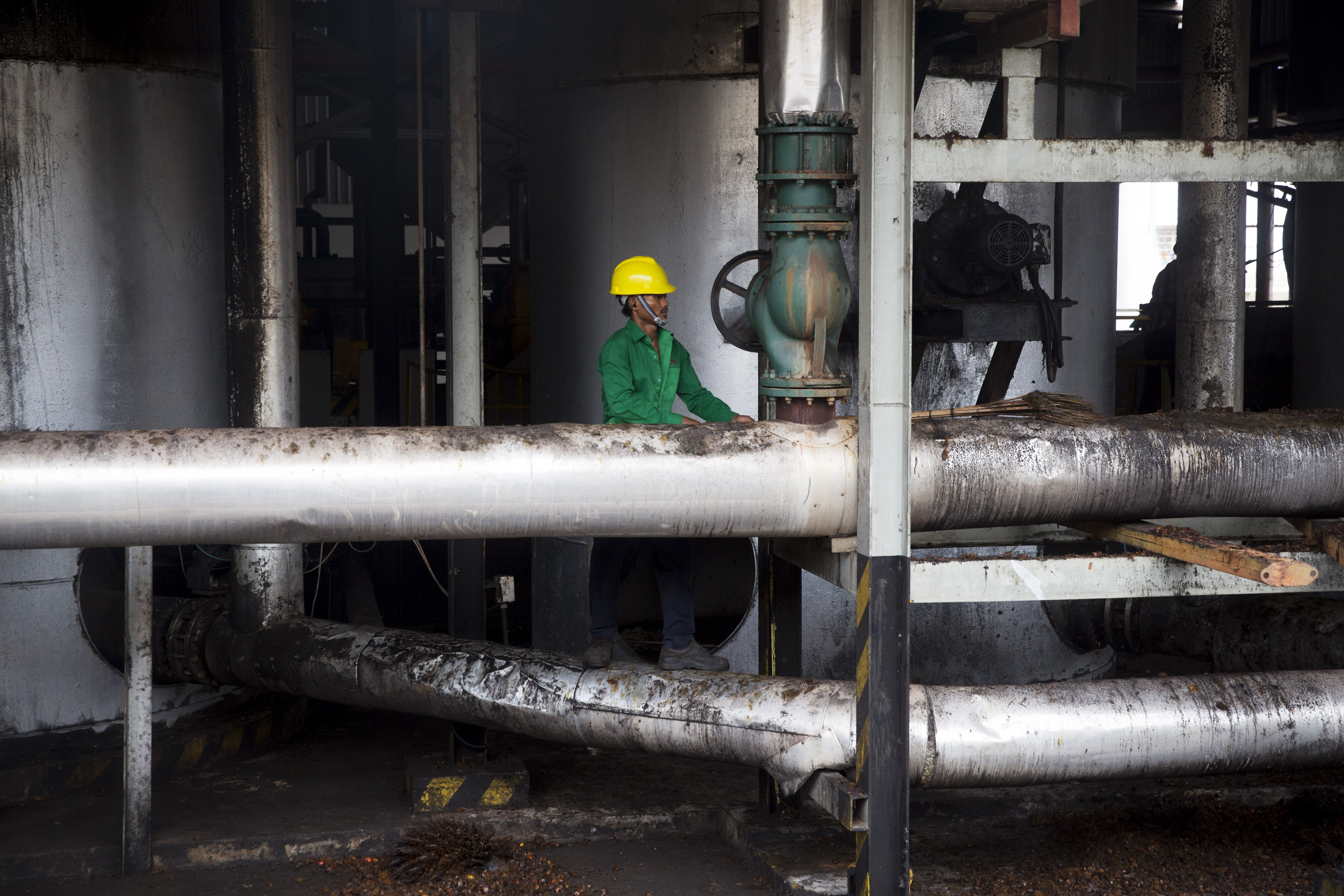 An employee stands on pipes that transport crude palm oil inside a processing facility (Photographer: Brent Lewin/Bloomberg)