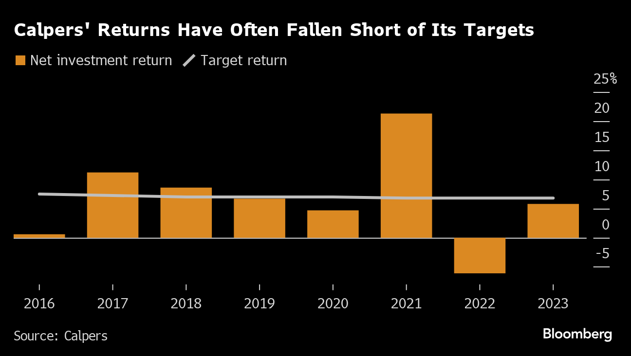 Calpers' investment portfolio earned a 5.8% return for the 12 months to June — below its annual return target of 6.8%. It was an improvement on the previous year's negative net return, but the pension fund's previous CIO, Nicole Musicco, departed shortly after.
