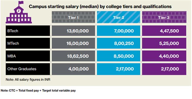 BTech students from Tier-1 colleges are being offered median pay of Rs 13.6 lakh while those from Tier-2 are getting Rs 7 lakh and and Tier-3 Rs 4.47 lakh.