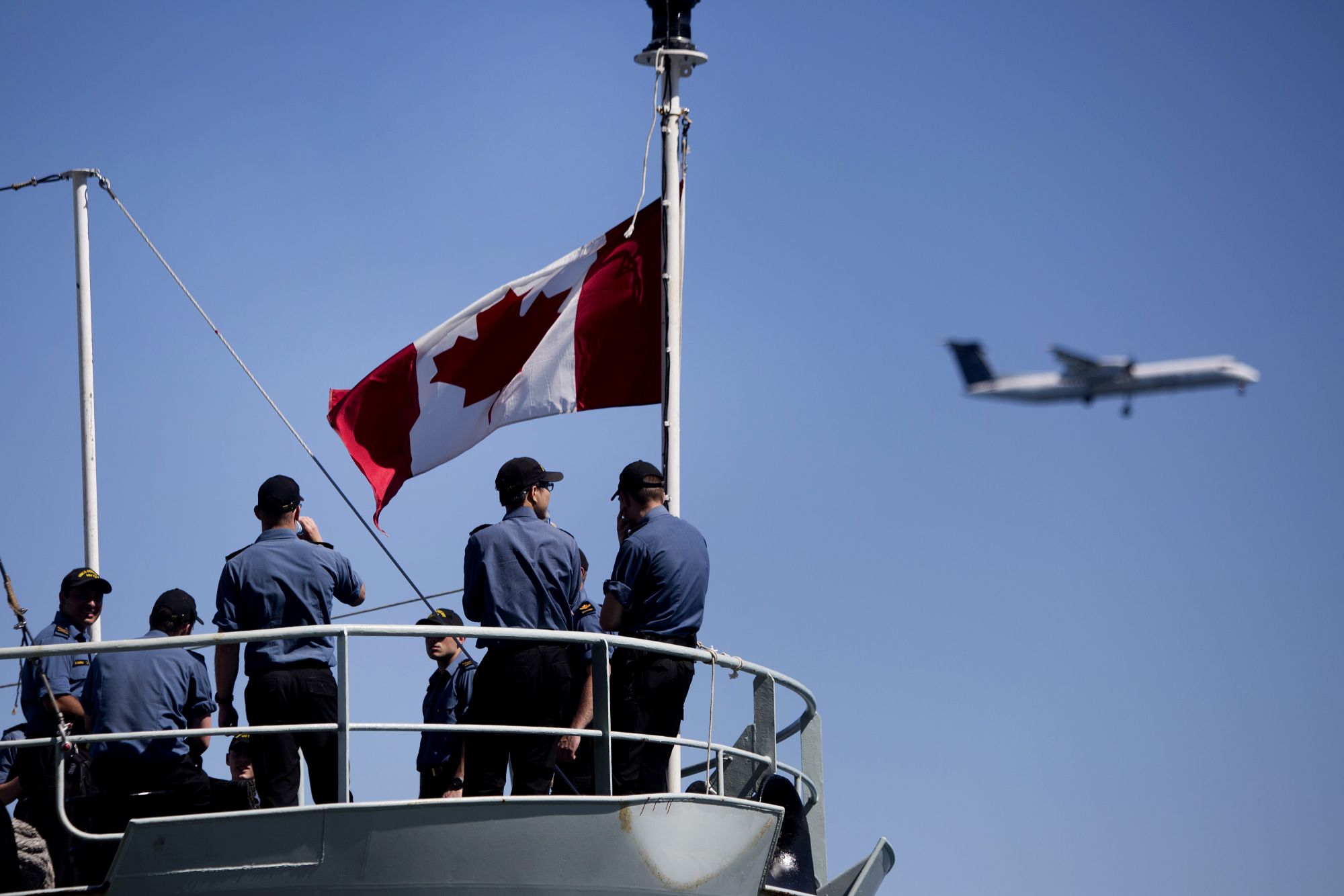 An airplane flies past a Canadian flag standing on a navy ship in Toronto, Ontario, Canada, on Wednesday, June 29, 2016. Photographer: Brent Lewin/Bloomberg