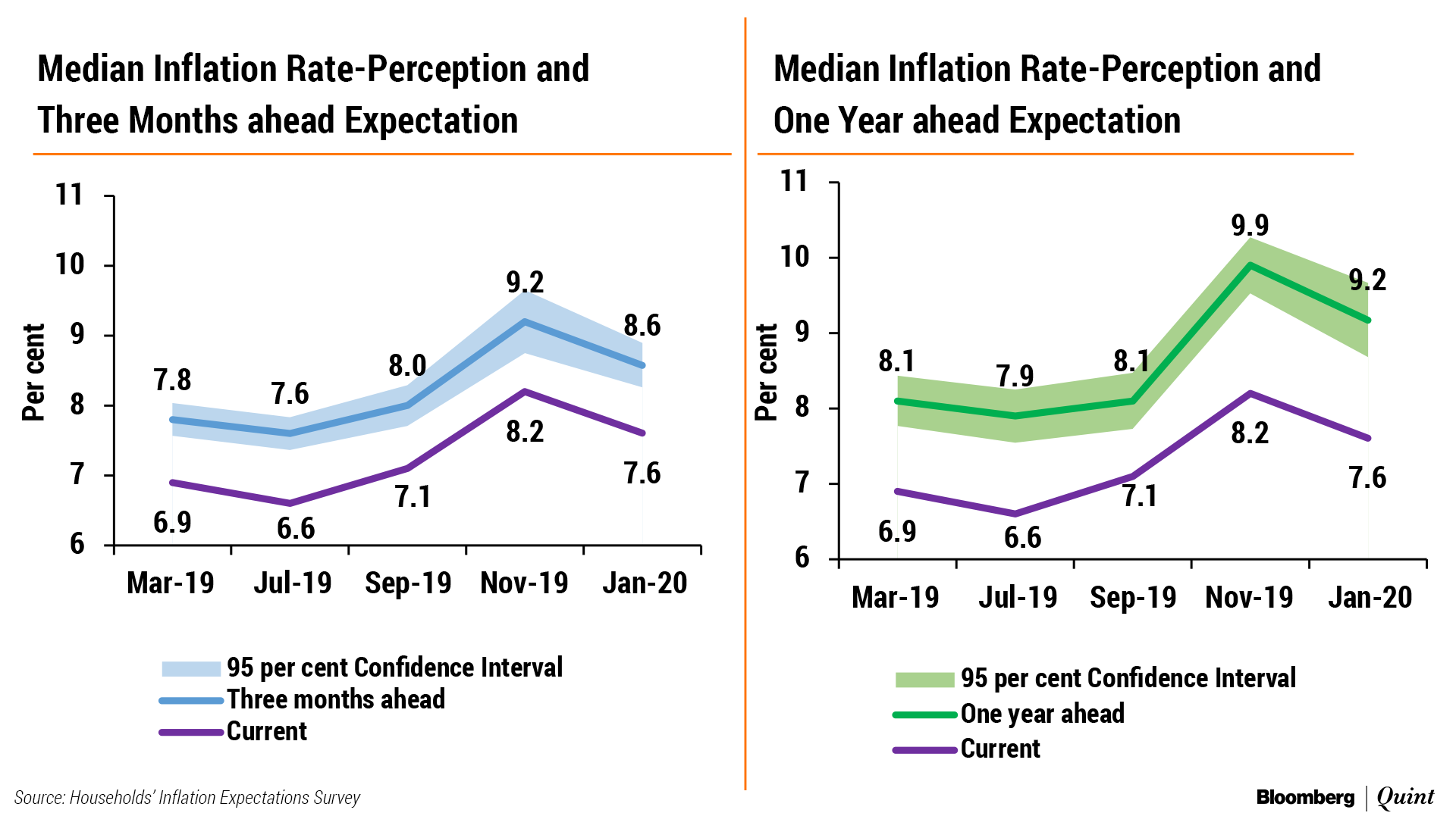 Inflation expectations of households moderated in January 2020 after a sharp pick up in November. Median inflation expectations over three-month and one-year horizons eased by 60 basis points and 70 basis points, respectively, according to the inflation expectations survey of households.