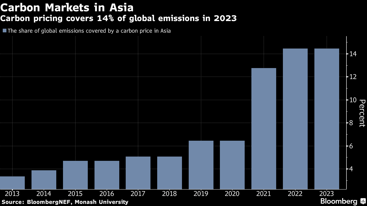 (Bloomberg) -- Asia is emerging as the key catalyst for growth in carbon trading, though the region's markets currently cover only a fraction of emissions that account for half the world's total.