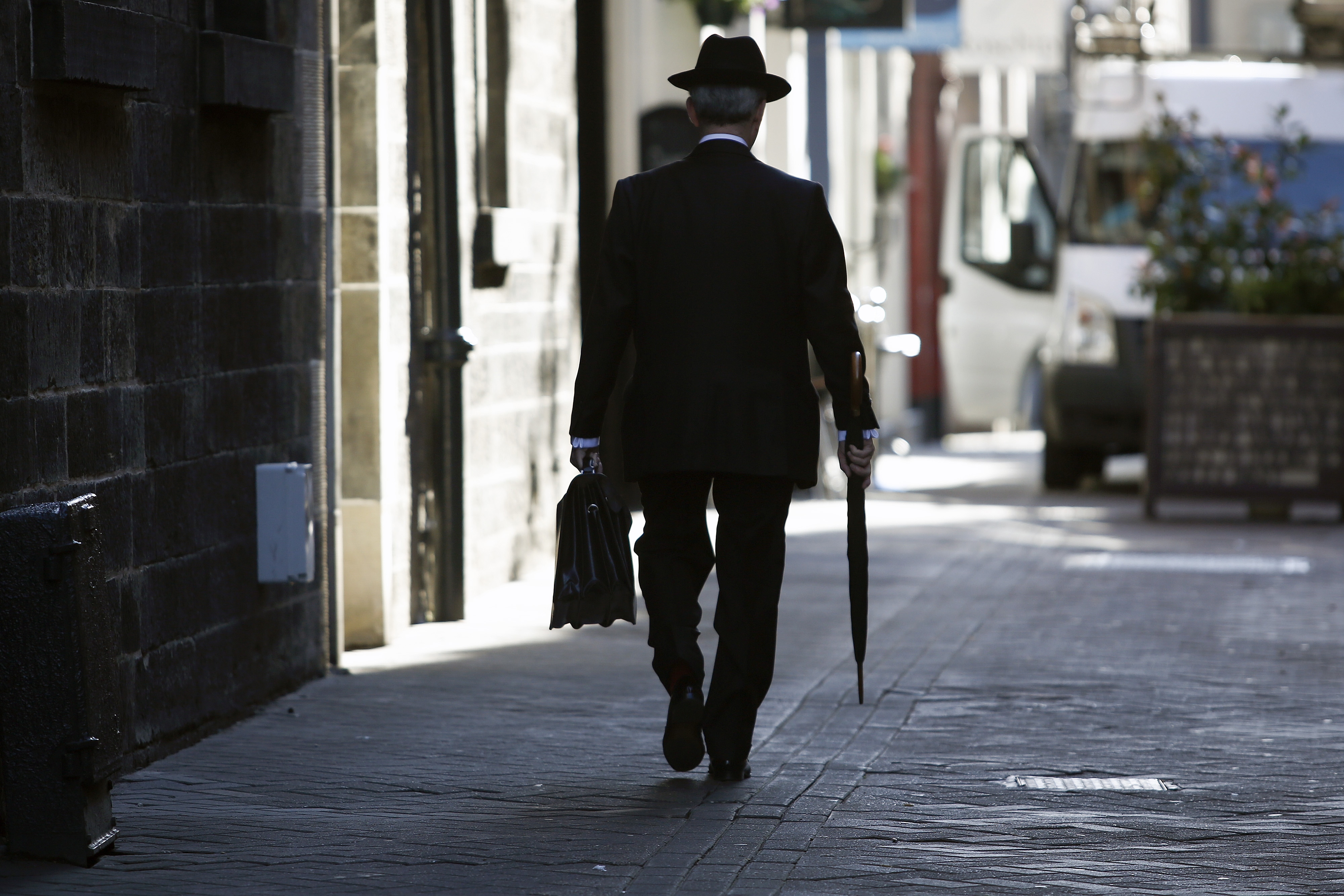A businessman carries a briefcase and umbrella as he walks along a street in Edinburgh, U.K. (Photographer: Simon Dawson/Bloomberg)